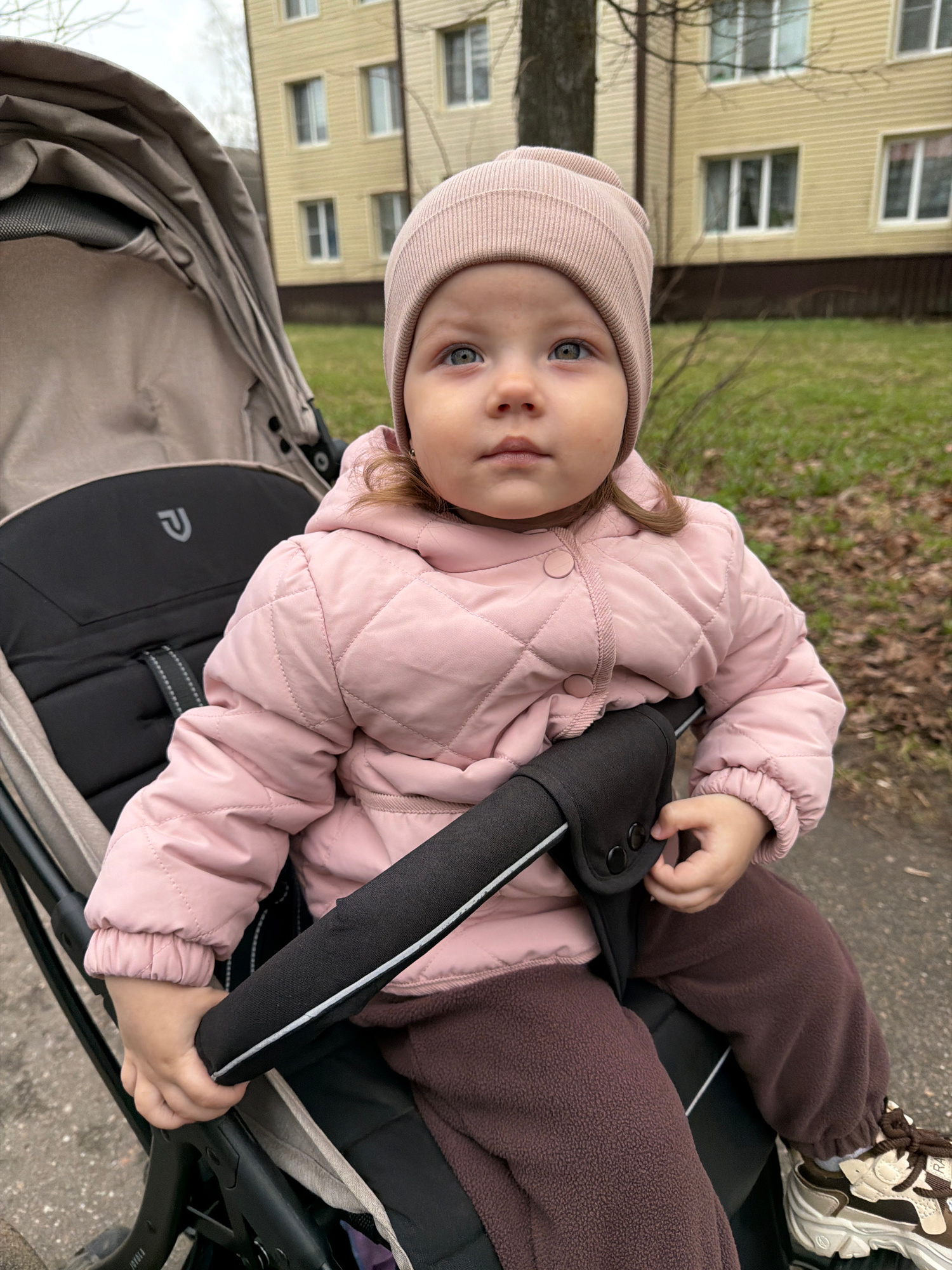 A young child wearing a pink quilted jacket and a matching knit hat is sitting in a stroller. The child also wears brown sweatpants and light-colored sneakers. The stroller is gray and black. The back…read more