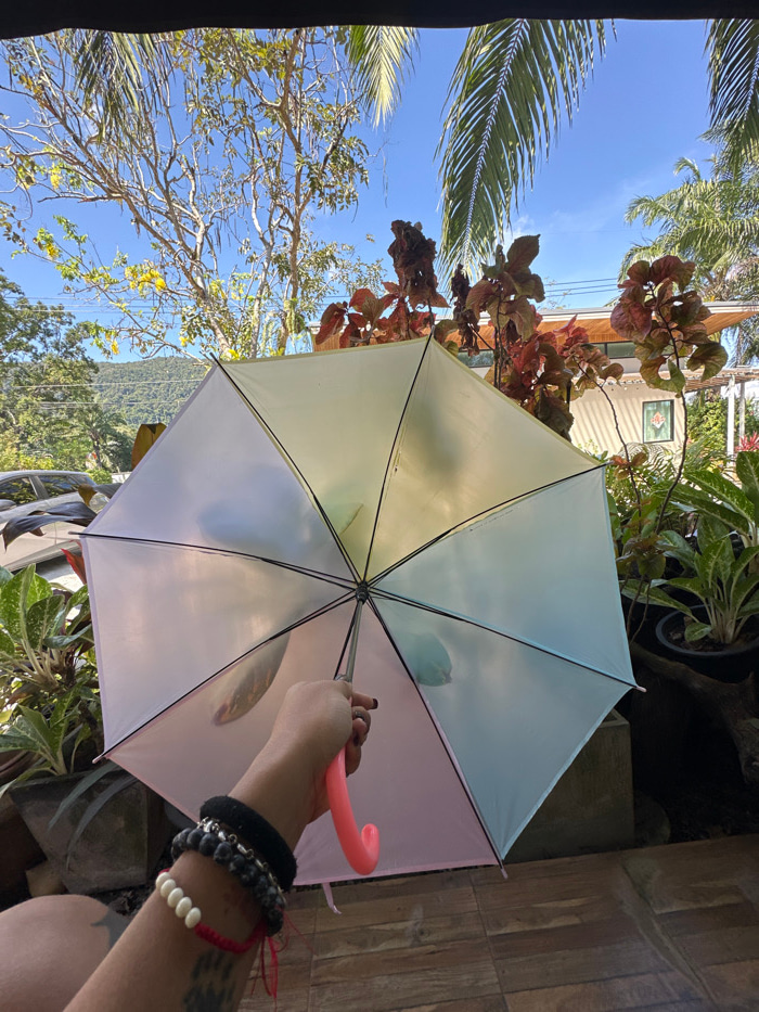 An open umbrella is held against a backdrop of a vibrant outdoor scene. Lush greenery, including palm trees and other plants, frames a clear blue sky. The umbrella's panels are a mix of pale yellow, l…read more