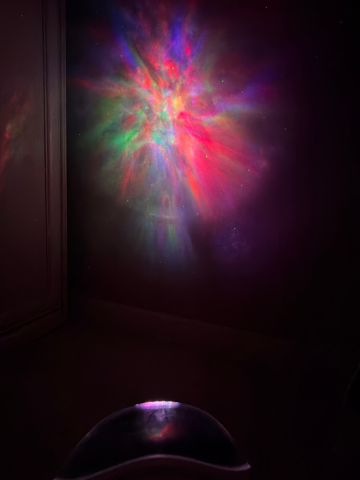 A low-light photograph captures a colorful projected image on a dark ceiling. The projection resembles a nebula or an abstract starburst, displaying reds, greens, purples, and yellows. Small, faint gr…read more
