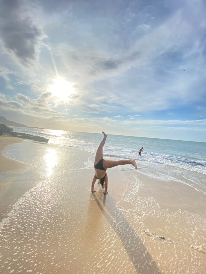 The image displays a beach scene in Juan Griego, Venezuela. A person wearing a dark two-piece swimsuit is performing a handstand on the wet sandy shore, facing away from the viewer, with hands on the…read more