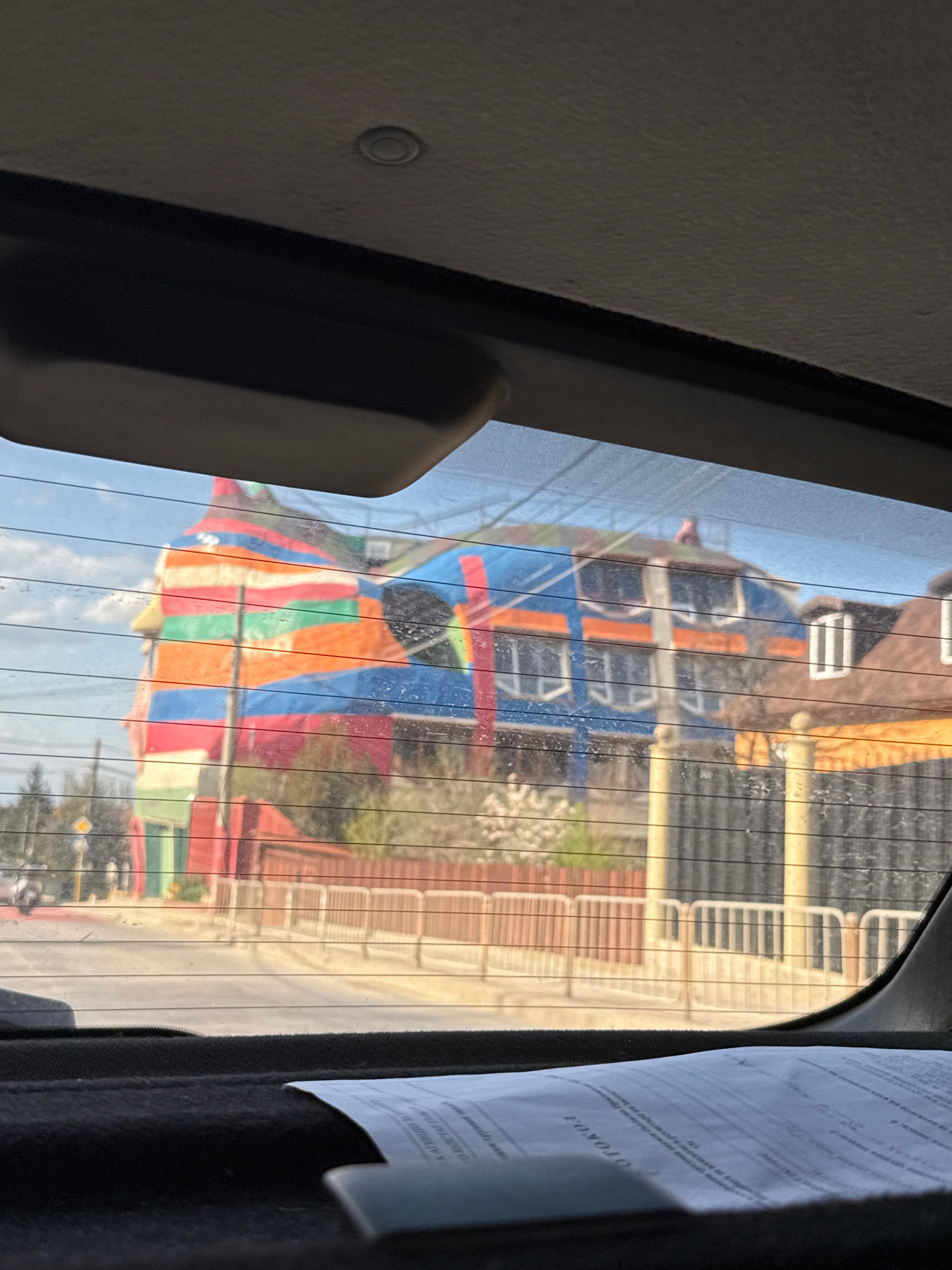 The image presents a view from inside a vehicle, looking out through its rear window. The window features distinct horizontal defroster lines. On the left, parts of the car's interior trim are visible…read more