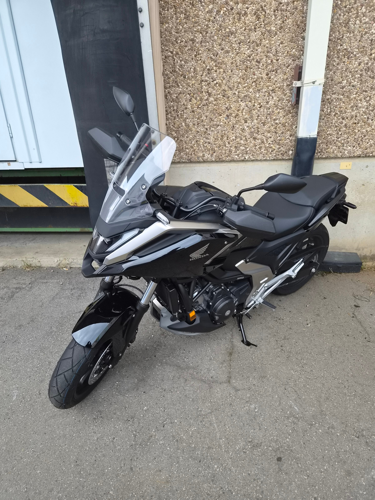 The image depicts a black Honda motorcycle parked outdoors on a grey asphalt surface. The motorcycle is positioned close to a building with a white garage door featuring black and yellow hazard stripe…read more