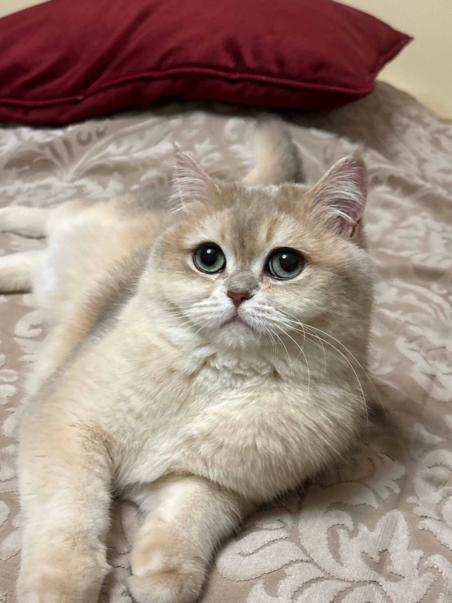 A close-up, high-angle shot captures a domestic cat, likely a British Shorthair, resting on a patterned bedspread or blanket. The cat features striking round, green-blue (teal) eyes that are wide and…read more
