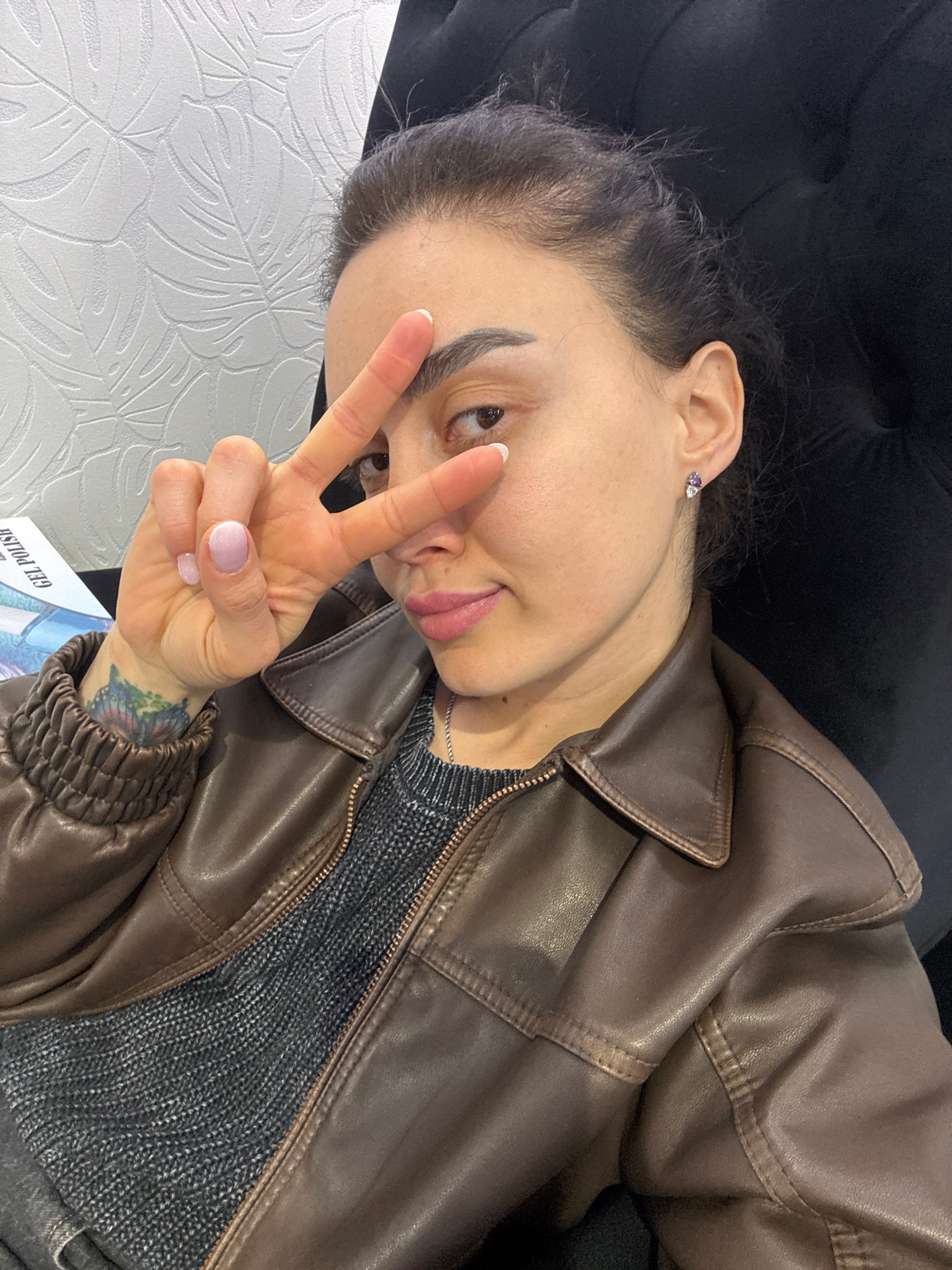 A woman is shown making a peace sign with her right hand, and wearing a brown leather jacket over a grey knit sweater, with a tattoo visible on her right wrist. The background includes a white surface…read more