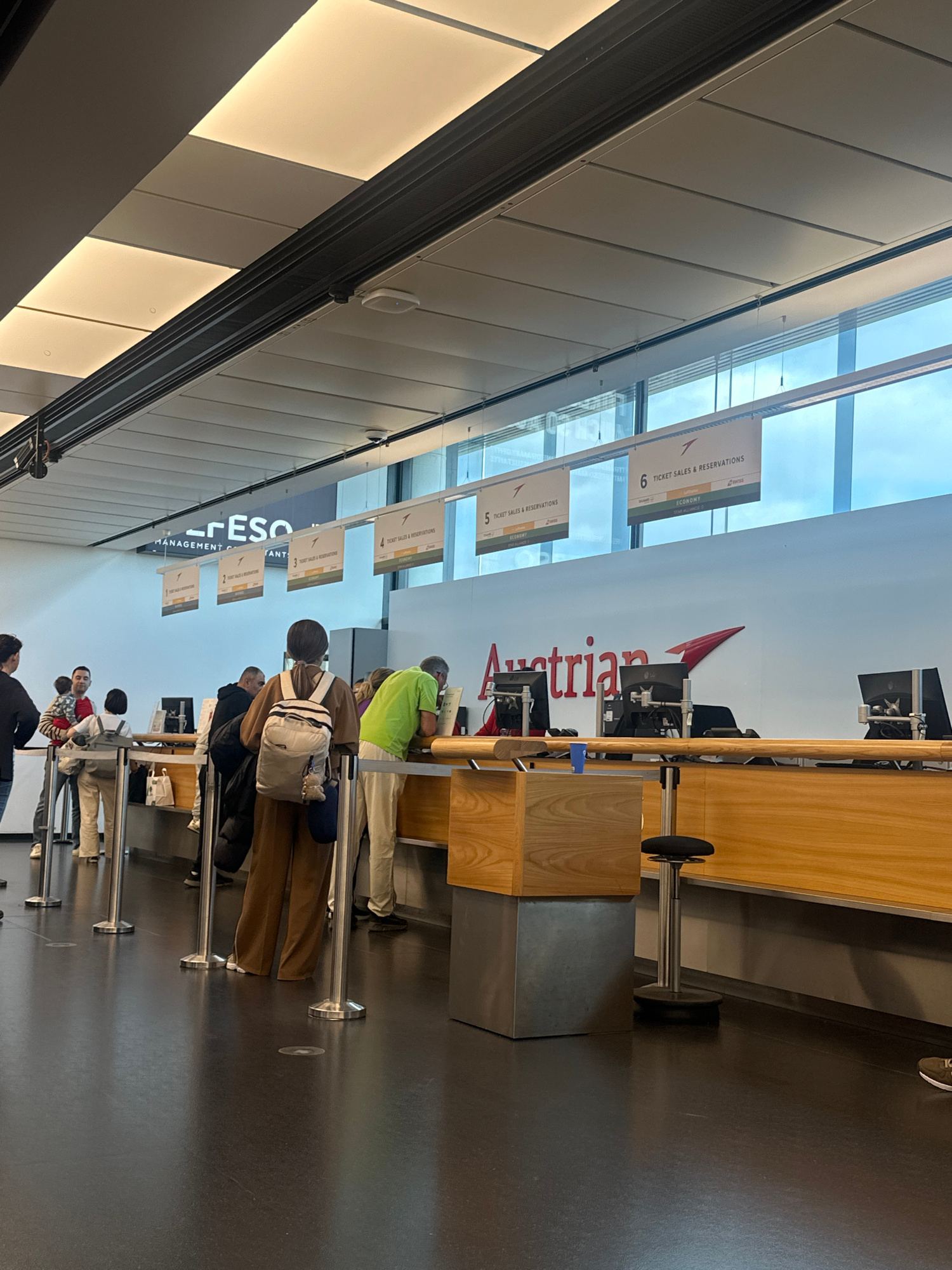 The image shows a queue of people at the Austrian Airlines ticket sales and reservations counters, likely at Vienna International Airport in Schwechat, Austria. People stand behind silver stanchions,…read more