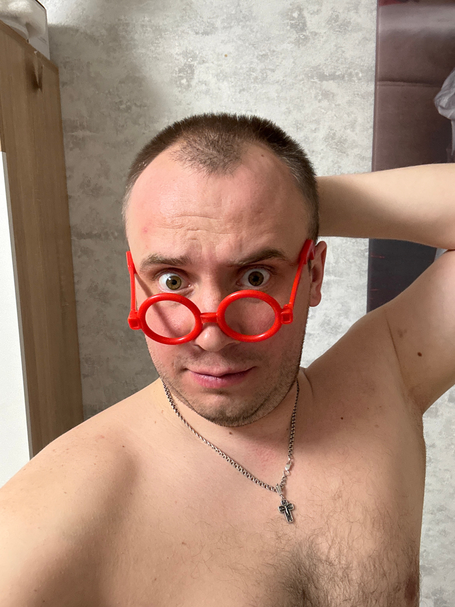 A shirtless man with short brown hair is wearing bright red, round novelty glasses and a silver necklace with a cross pendant. He is indoors. The background consists of a patterned wall, a brown surfa…read more
