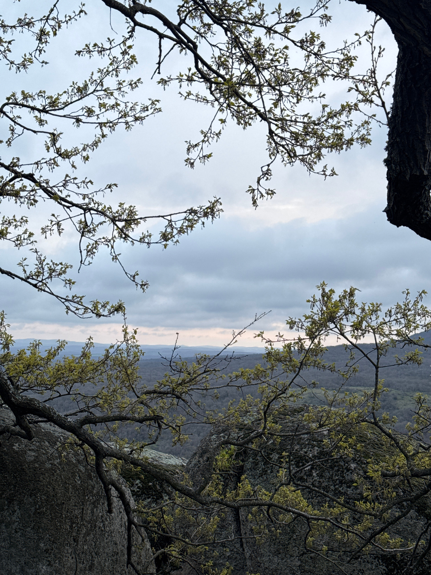The image is a landscape shot looking through trees with new spring growth. On the left, branches from a tree in the lower foreground reach upwards, partially obscuring the cloudy sky. At the top of t…read more