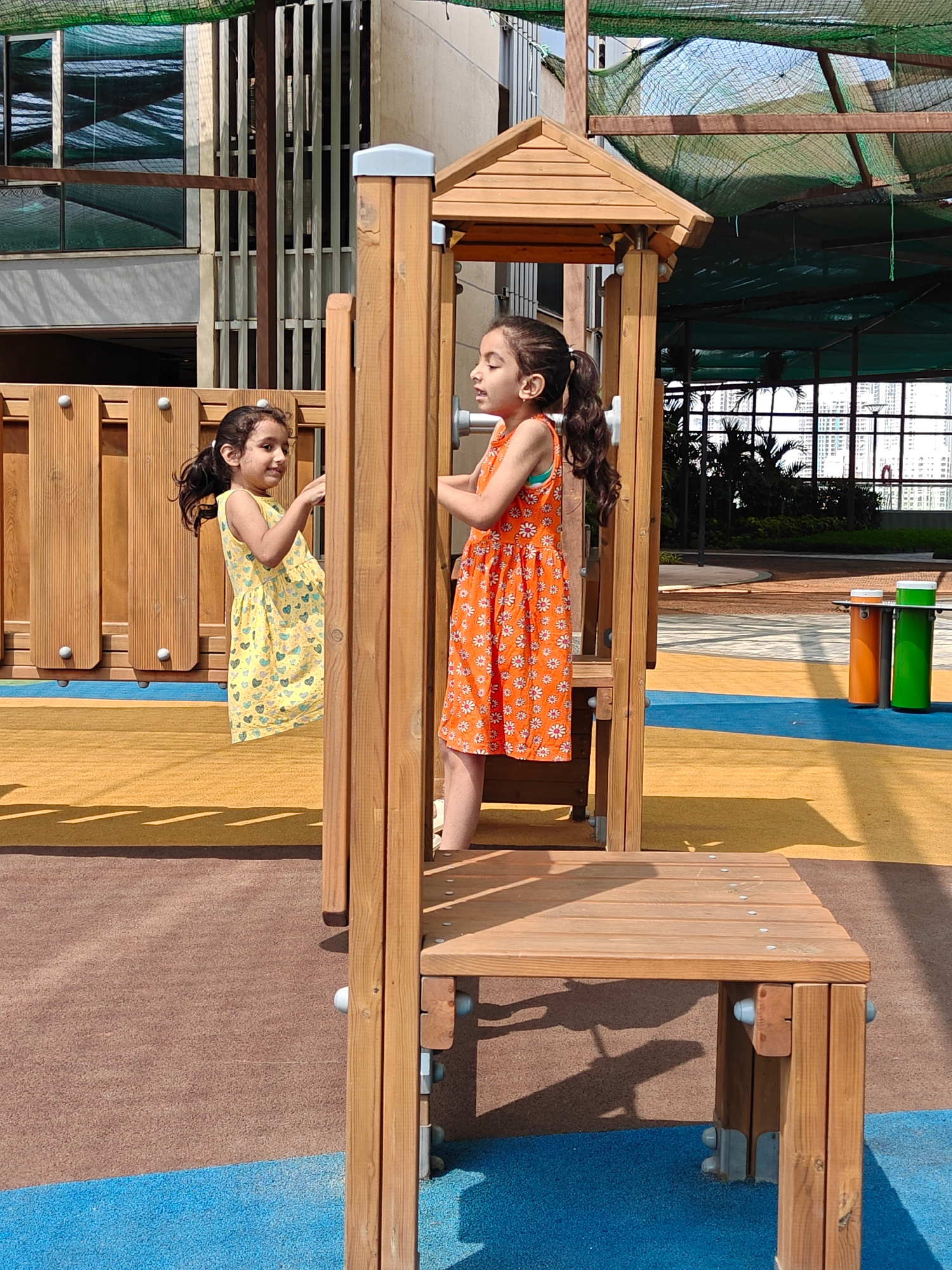 Two young girls are playing on a wooden playground structure. One girl is wearing an orange dress with white flower patterns and is standing inside the structure, holding onto a vertical bar. The othe…read more