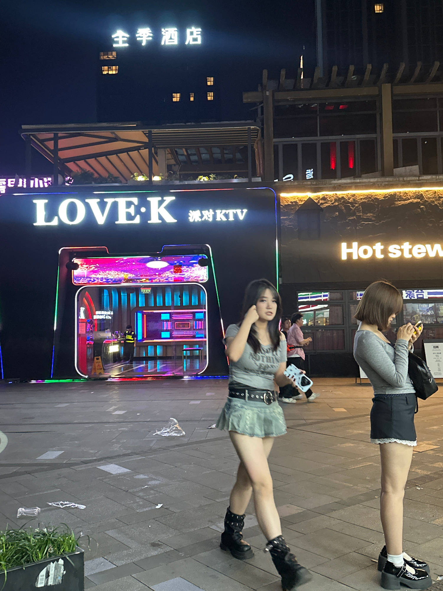 The photo captures an outdoor urban scene in Chongqing High-tech Zone, China. Two young women are prominently featured on a pedestrian area. One is positioned closer to a "LOVE-K" KTV sign with neon l…read more