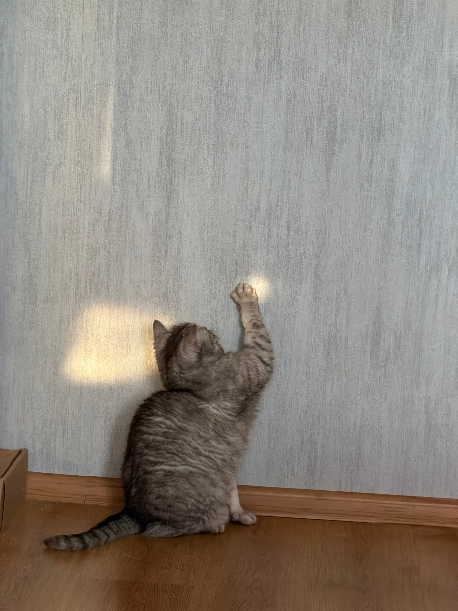 A grey tabby cat is lying on a grey floor, near a light-brown wooden door in a room with walls with a grey wood grain pattern. The cat is stretching, with one paw extended in front of it. A patch of s…read more