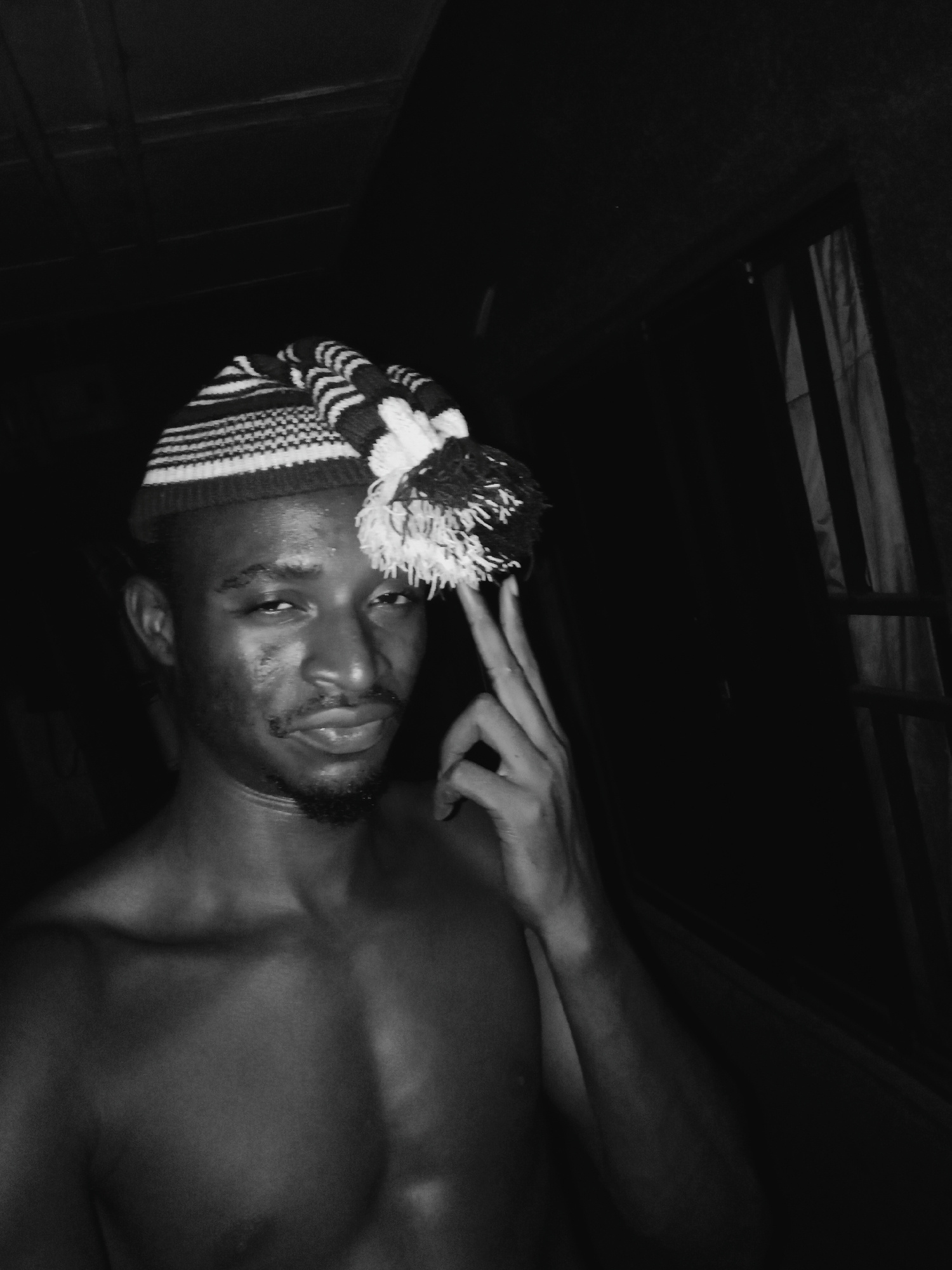 This black and white portrait captures a shirtless man, appearing to be of African descent, posing for the camera indoors in Onitsha, Nigeria. He is seen from the chest up, looking directly at the vie…read more