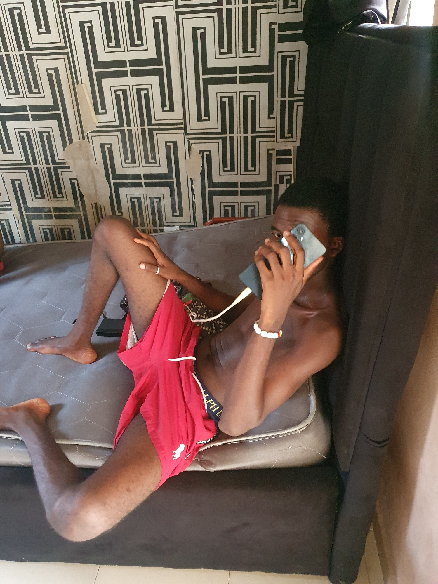 An individual with dark skin is lying on a gray sofa. He is shirtless and wearing red shorts with a white drawstring. The person is holding a gray smartphone to their ear with their right hand, and a…read more