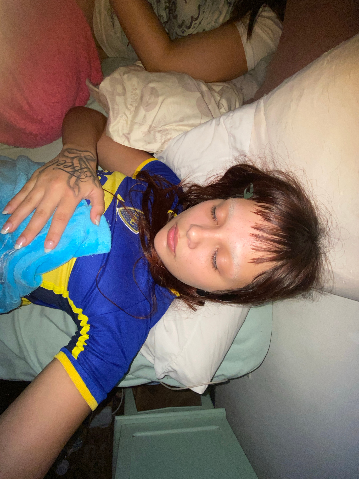 A woman is lying in a bed. She has brown hair, light eyebrows, and her eyes are closed. She is wearing a blue and yellow soccer jersey with the Boca Juniors crest on it. Her left hand is resting on a…read more