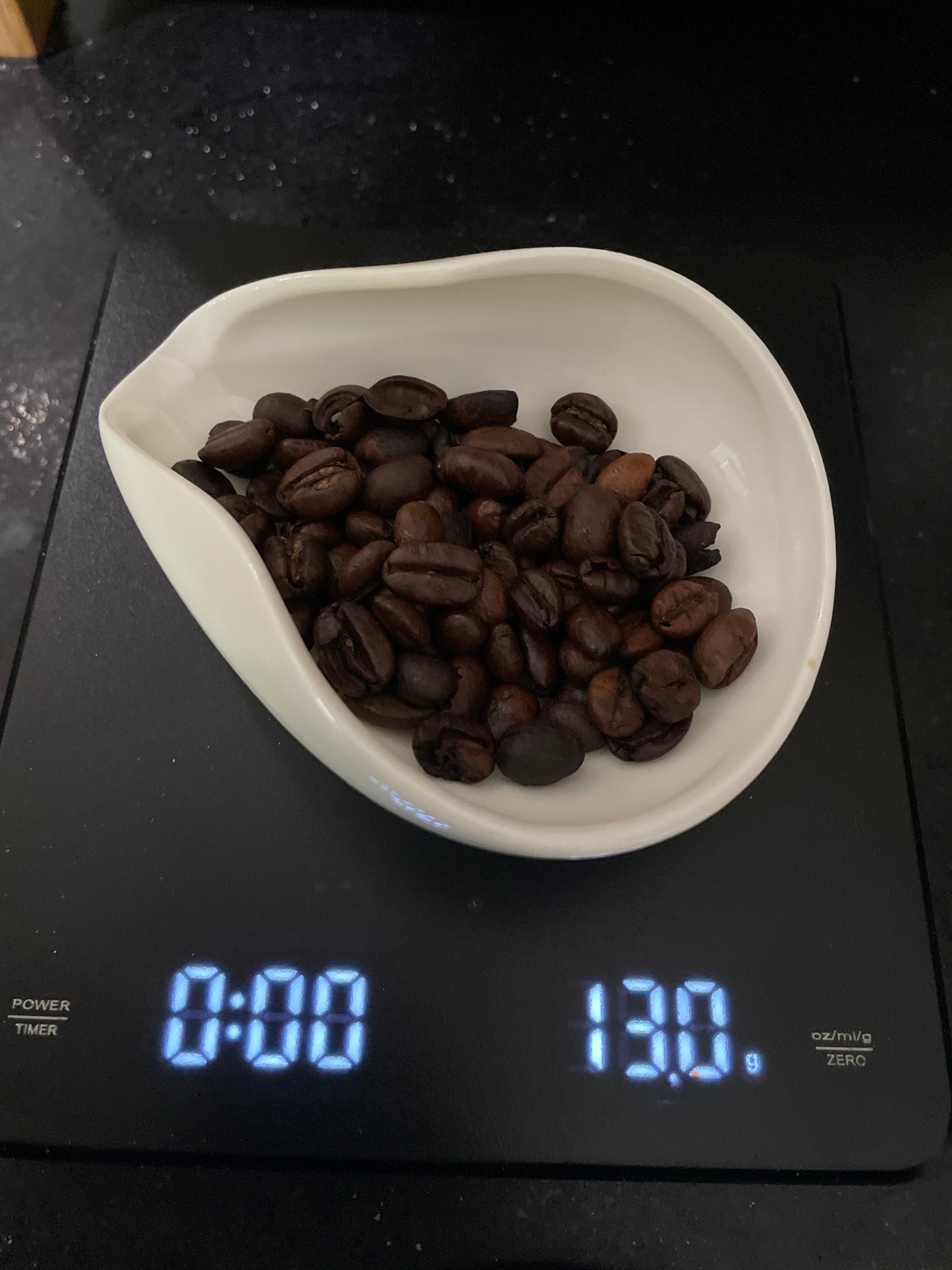 The image captures an overhead view of coffee beans being weighed on a digital kitchen scale, set against a dark, speckled background, likely a kitchen countertop. A pile of dark roasted coffee beans…read more