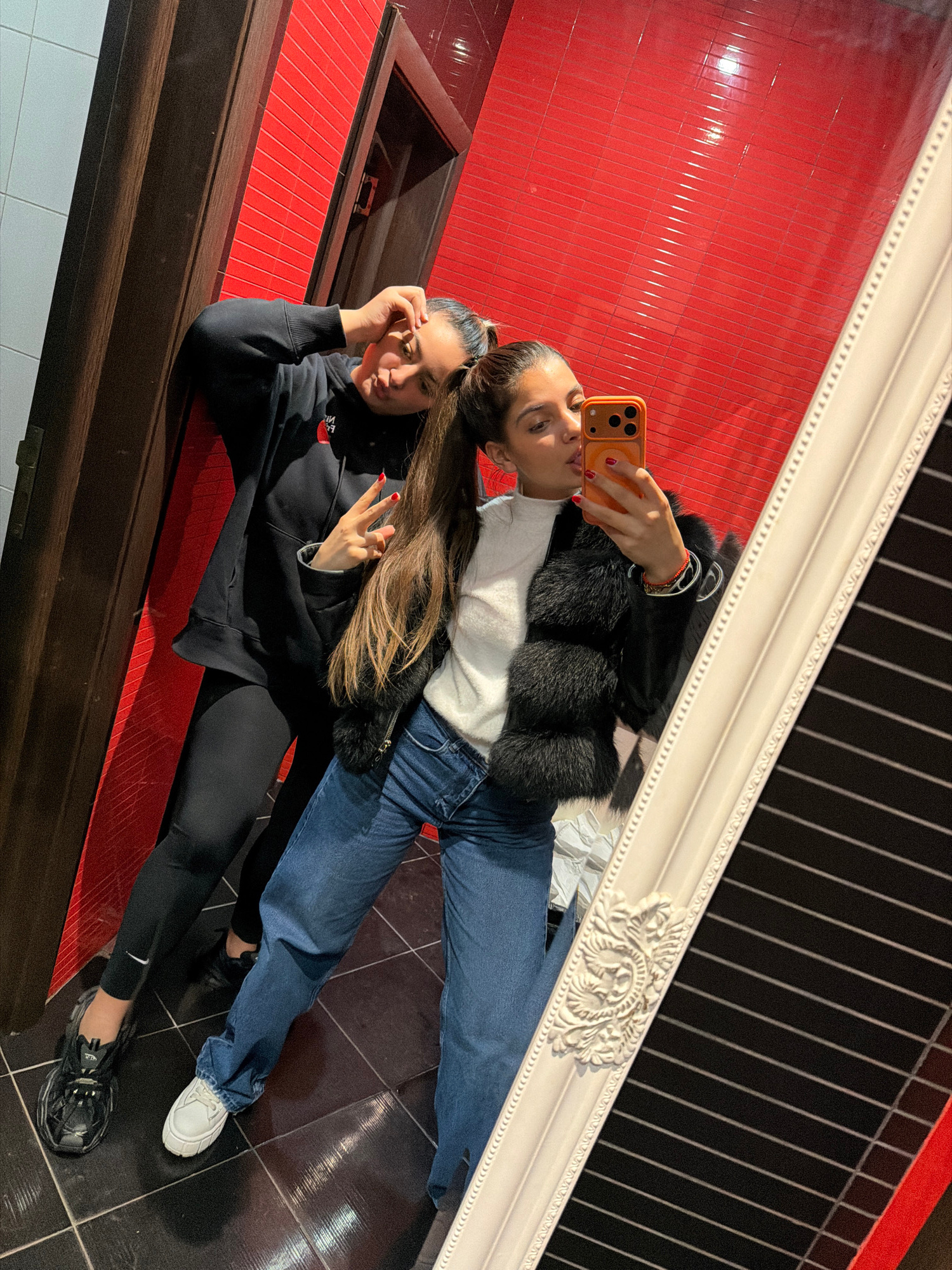 Two women are reflected in a large mirror, likely taking a selfie. One woman, closer to the bottom of the frame, is wearing a black hoodie and leggings with black sneakers. She has dark hair pulled ba…read more