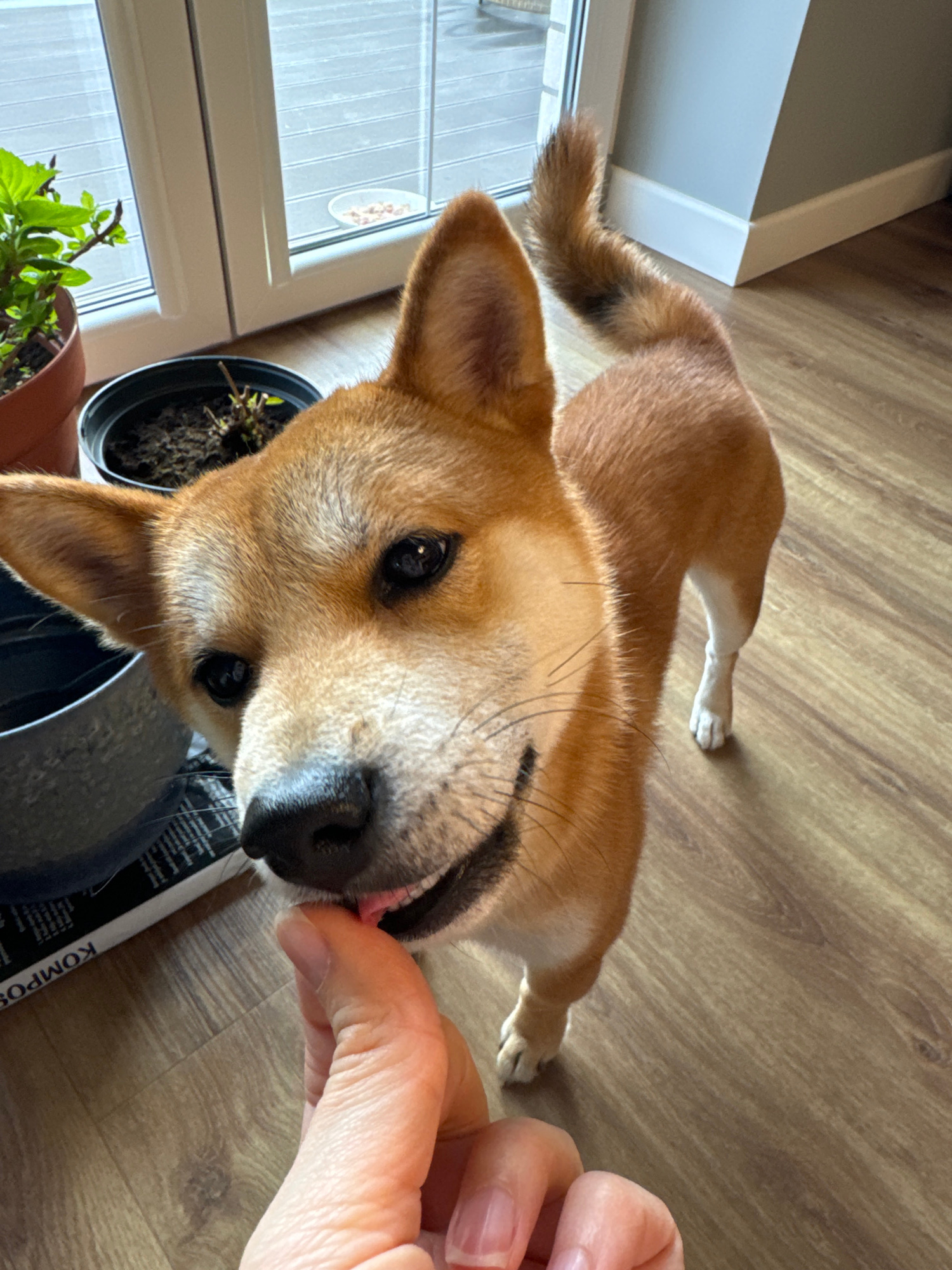 A tan and white Shiba Inu dog is lying on a light brown wood-grained floor in what appears to be an indoor setting. The dog's head is close to the camera, with a hand offering the dog a treat. The dog…read more