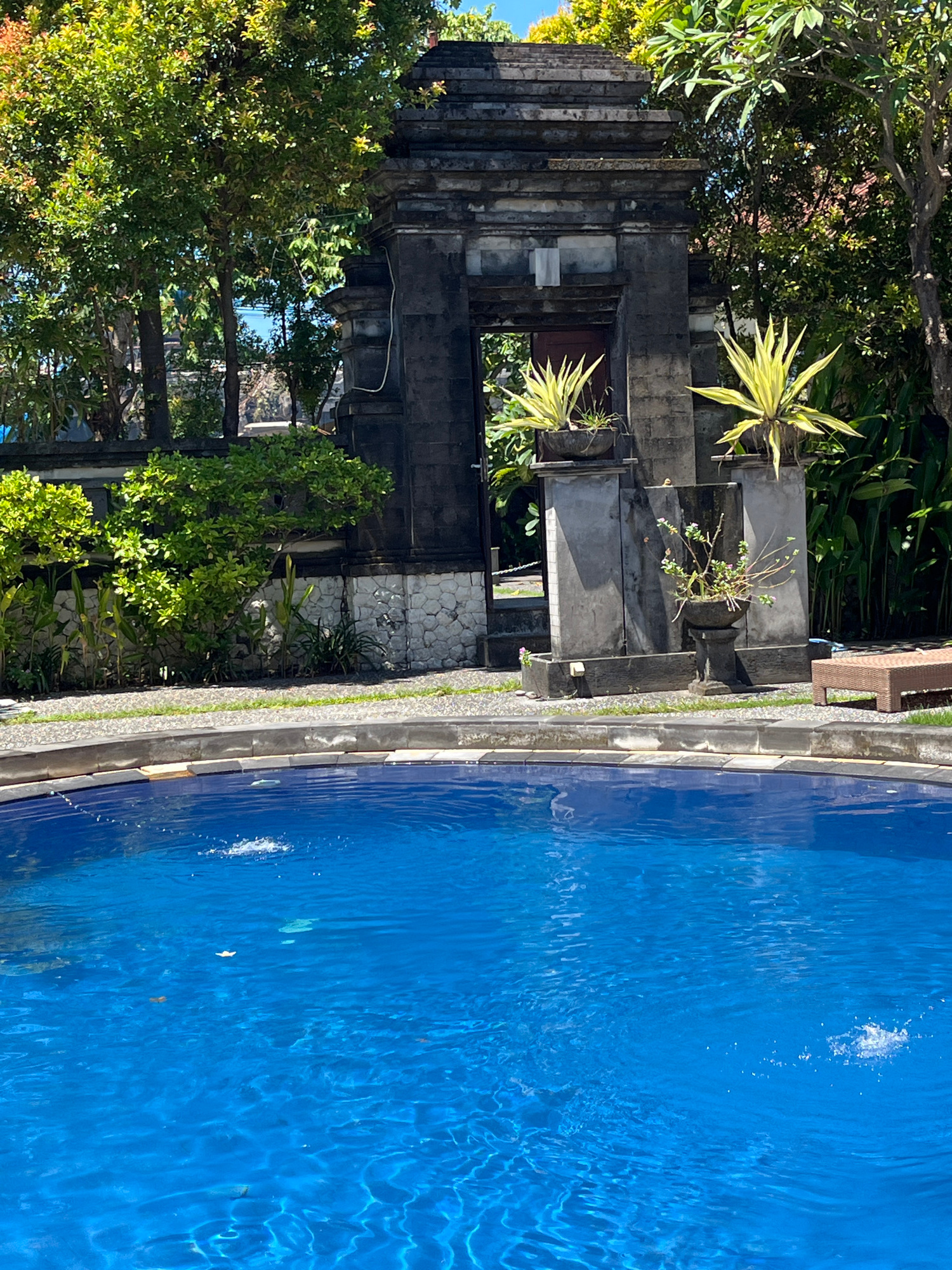 A daytime shot depicts an outdoor scene in Kuta Selatan, Indonesia. On the left, a multi-tiered stone structure, possibly a traditional Balinese temple or building facade, is partially obscured by lus…read more