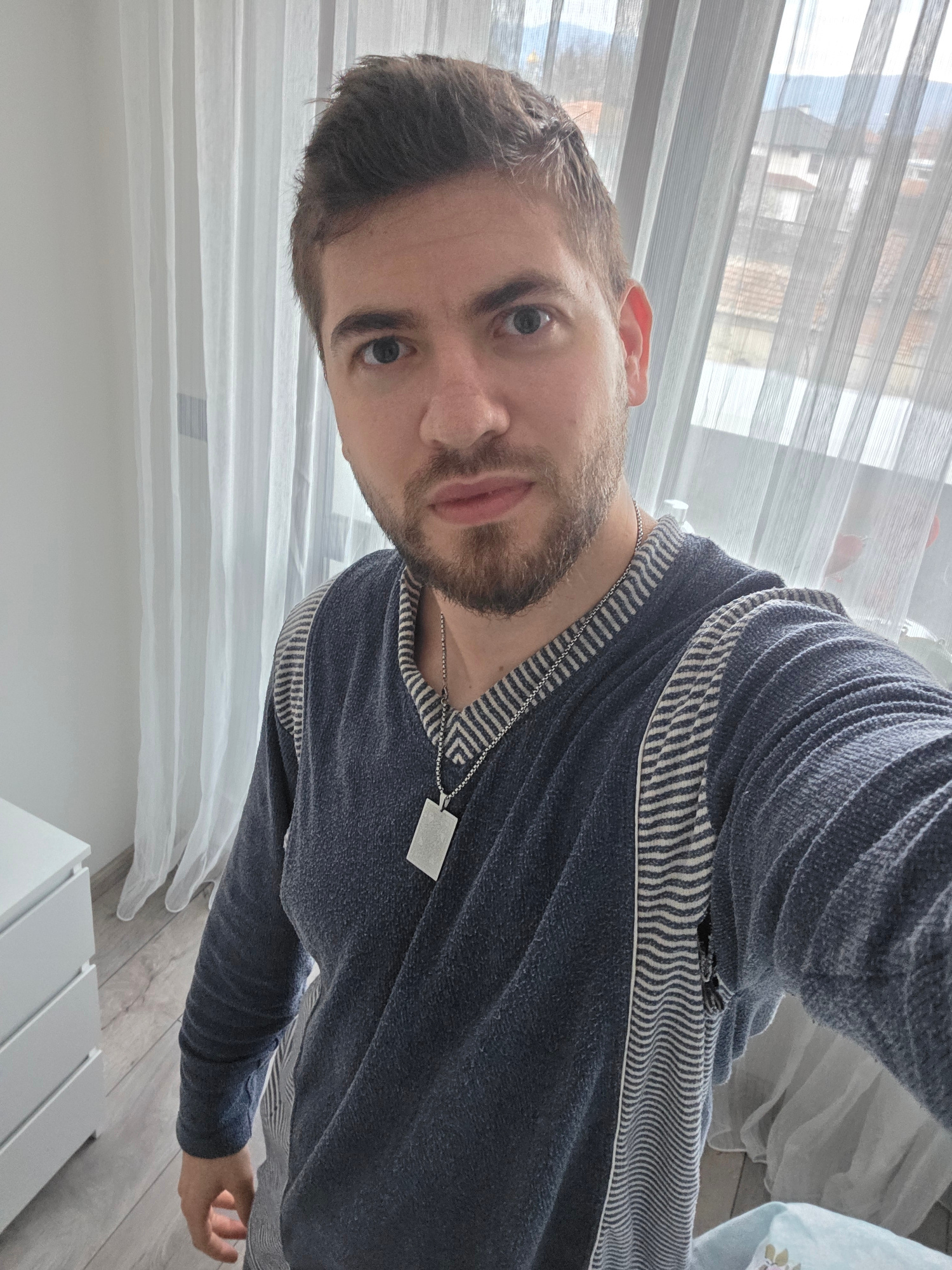 A man with short brown hair and a beard is wearing a navy blue bathrobe with white stripes and a silver necklace with a rectangular pendant. He is indoors with white curtains behind him and a window s…read more