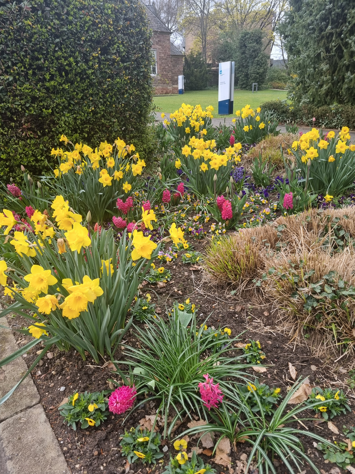 The image shows a flower bed in Saarbrücken, Germany. Yellow daffodils and pink hyacinths are in bloom. Pansies are also visible. A neatly trimmed hedge borders the flower bed on one side. In the back…read more