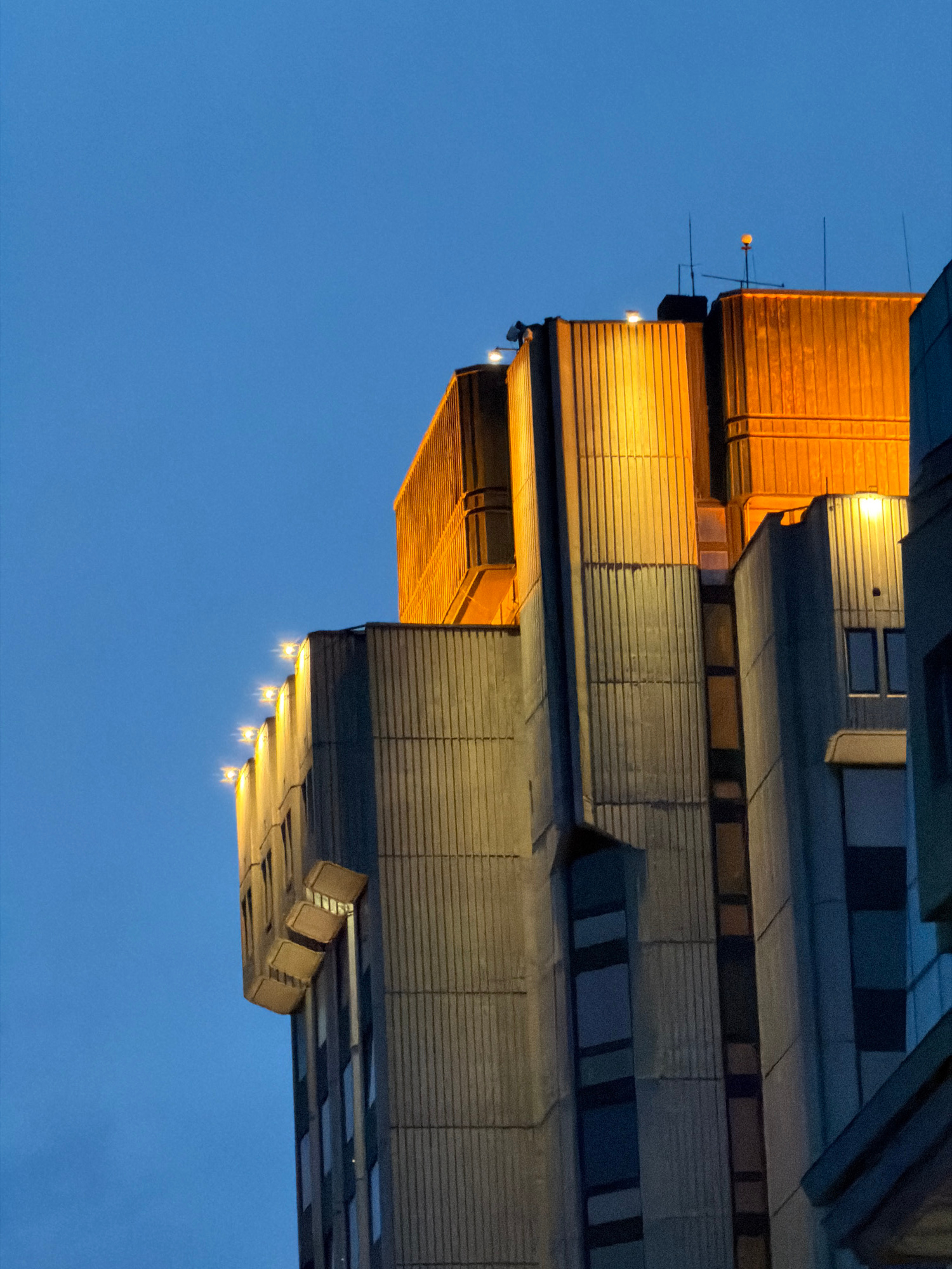 This image shows the architecture of a building against a blue sky. The building features a repeating pattern of gray horizontal panels. Some sections have orange accents and multiple small lights are…read more