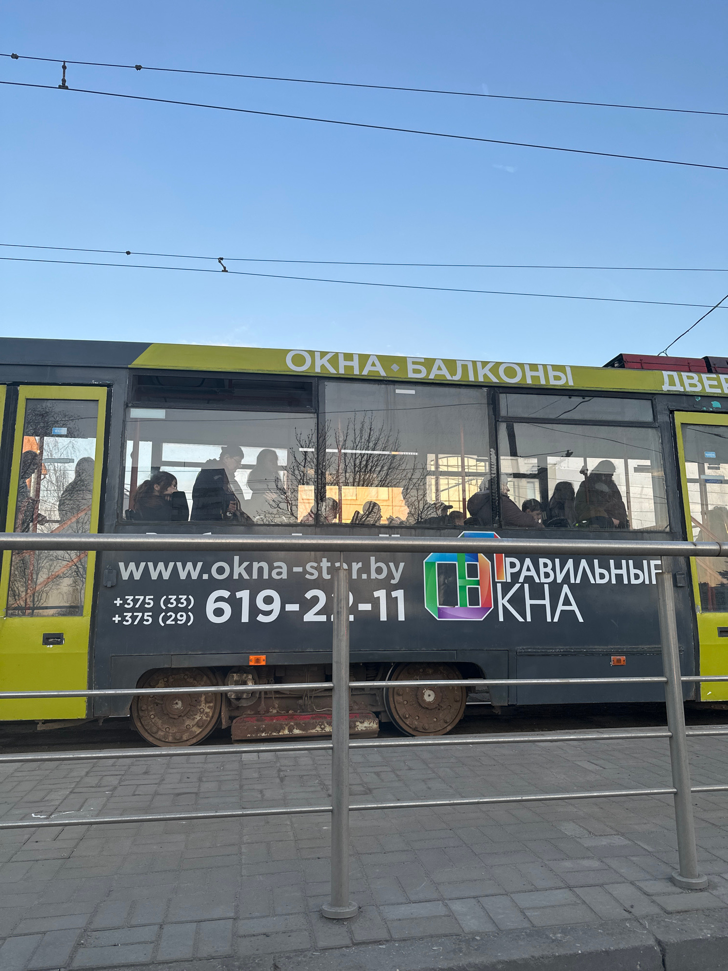 The image depicts a side view of a yellow and black public tram in Vitsebsk, Belarus. The tram is stationary on a street with gray paving stones. The side of the tram features an advertisement in a no…read more