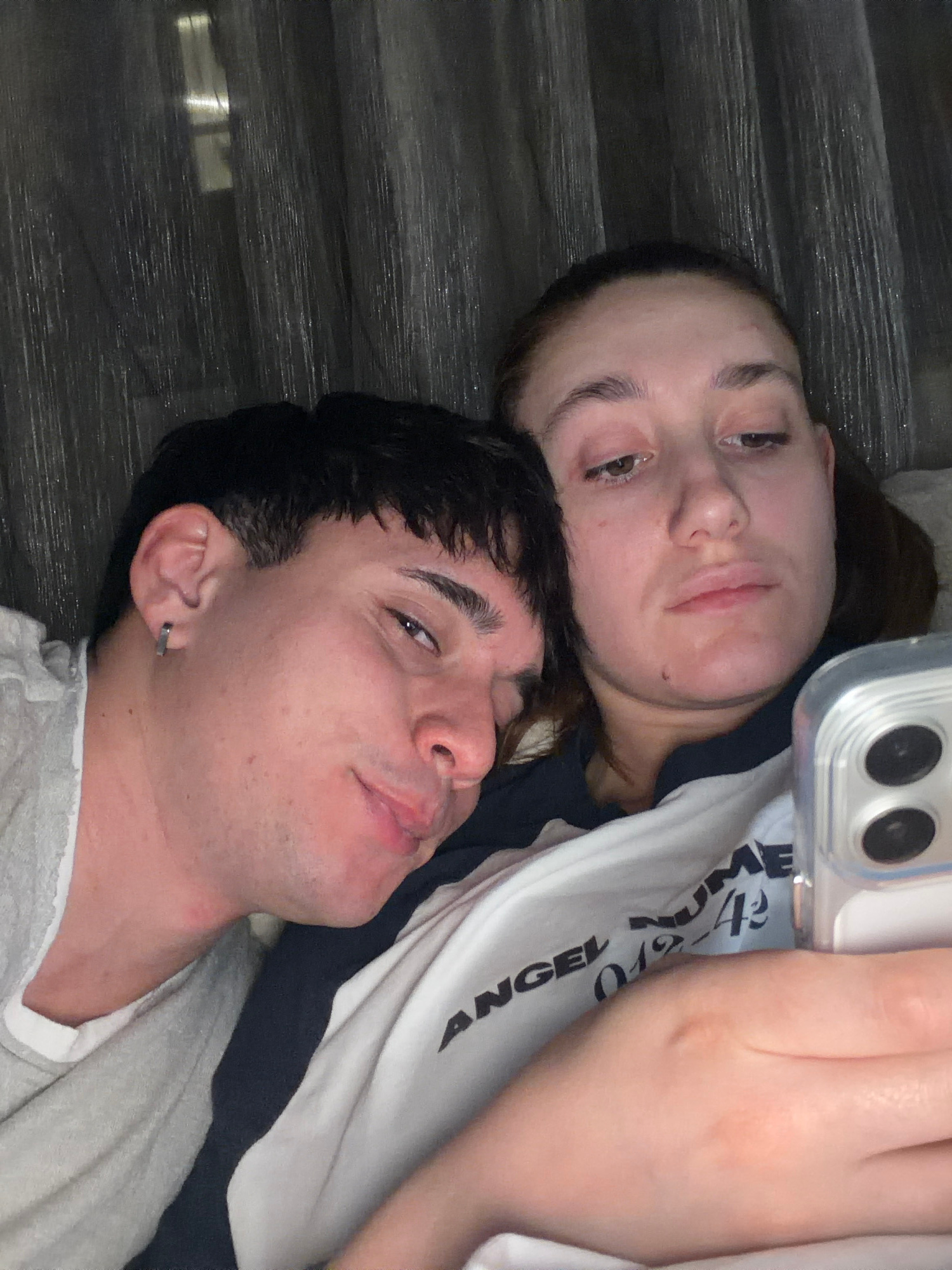 Two individuals are positioned close together, likely in an indoor setting based on the artificial lighting. The surface beneath them is a dark, textured material, possibly carpet or stairs. A mobile…read more