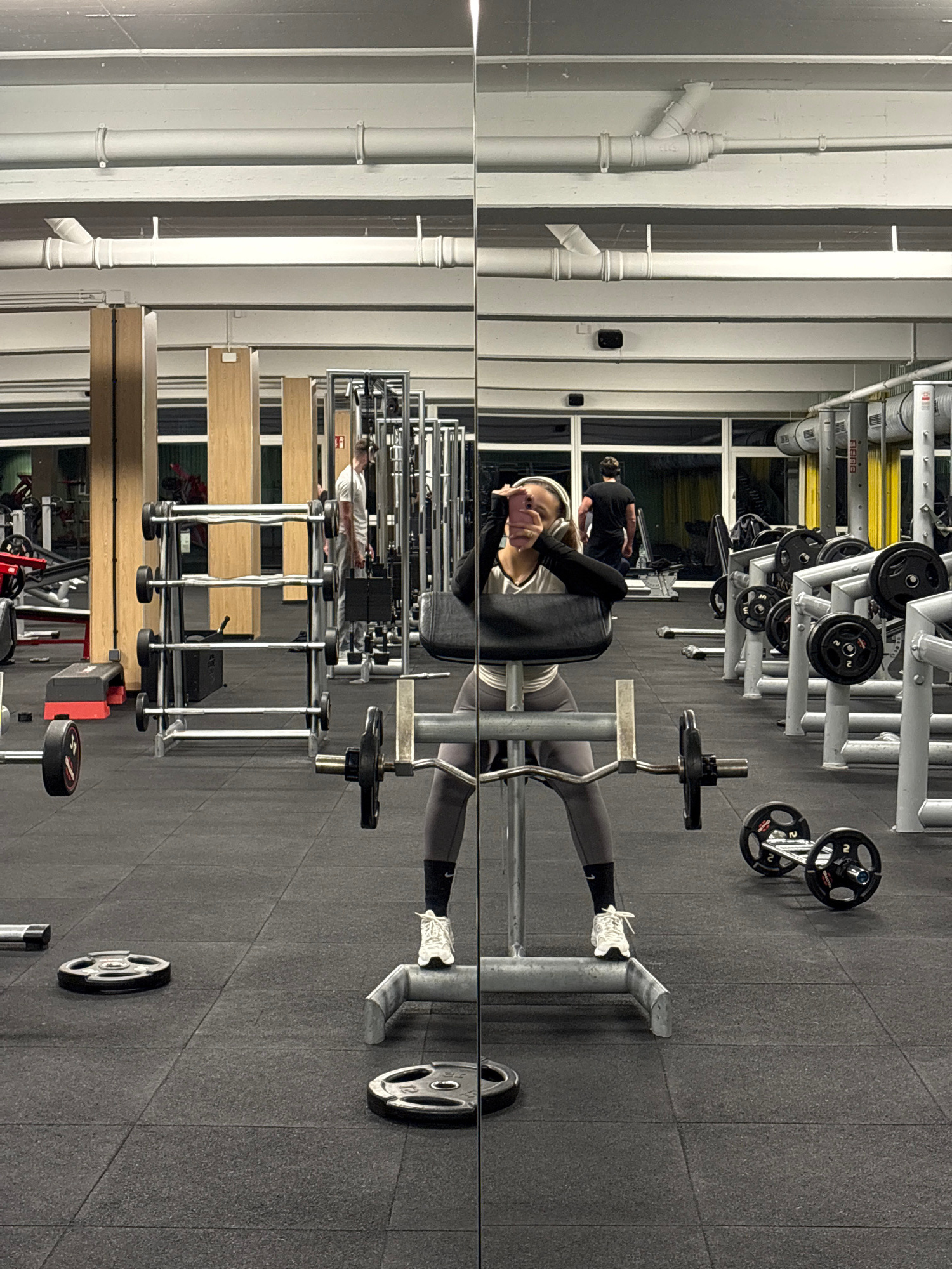 A young woman is seen in a gym setting, positioned on a leg extension machine. She is wearing light-colored workout clothing, and white sneakers. The woman is looking towards the viewer and has her ha…read more
