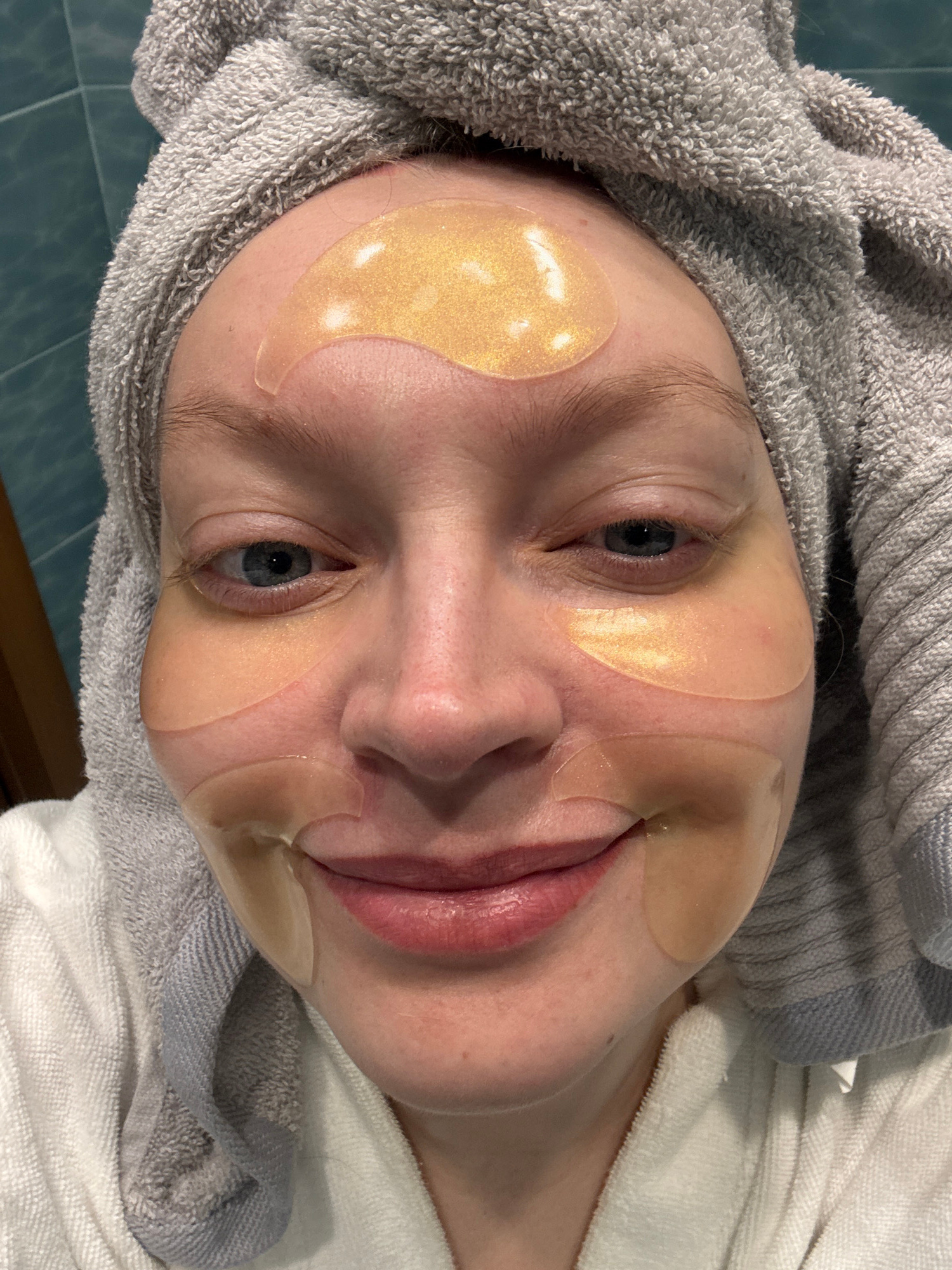 A woman lies on her back, wearing a gray towel wrapped around her head and a white towel around her neck. She has facial patches applied to her forehead, below her eyes, and around her mouth. Her eyes…read more