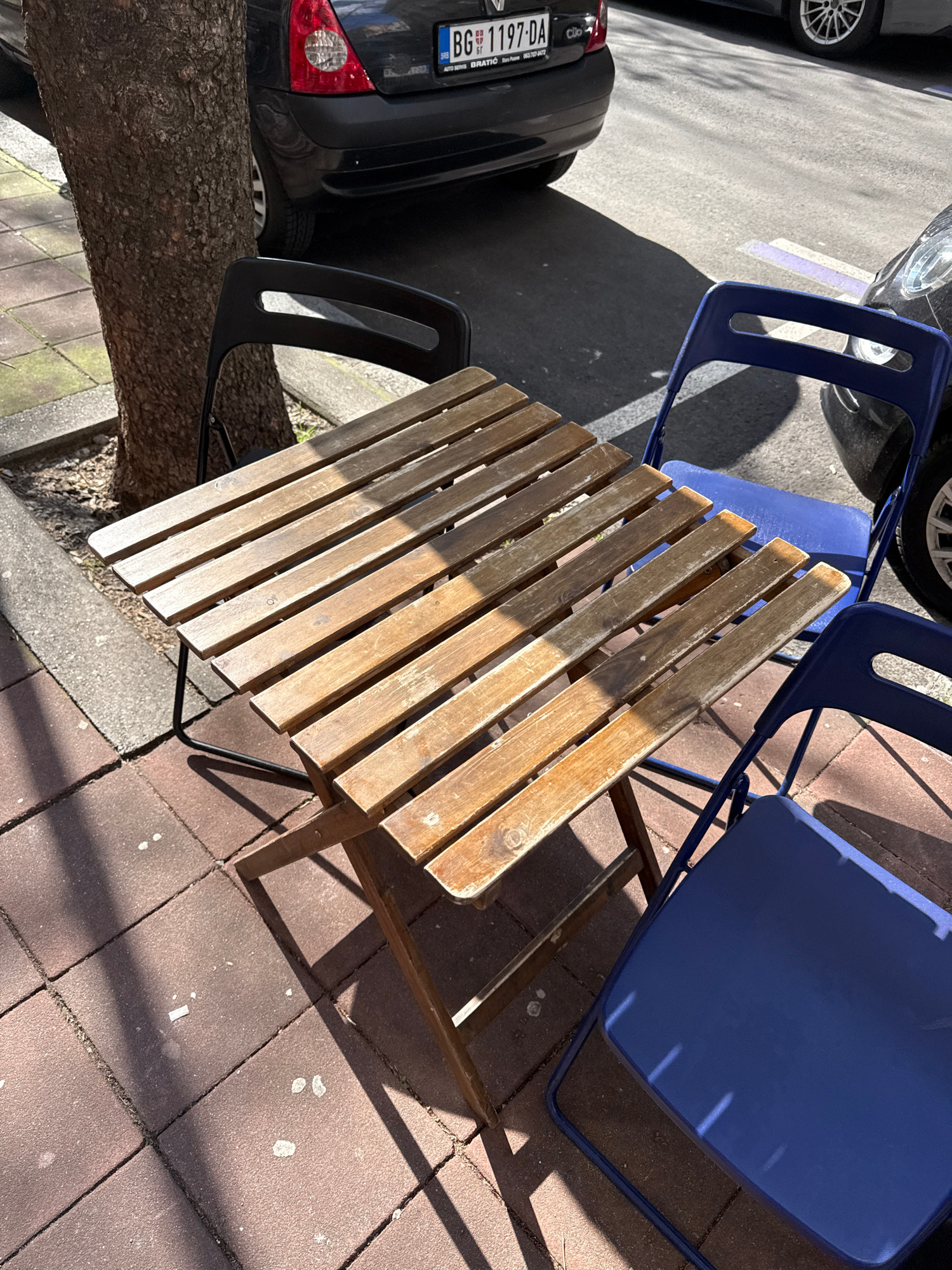 The image presents a top-down view of a small, outdoor seating area. A square wooden table with a slatted surface is centrally located. Two blue metal chairs flank the table, one positioned to the upp…read more
