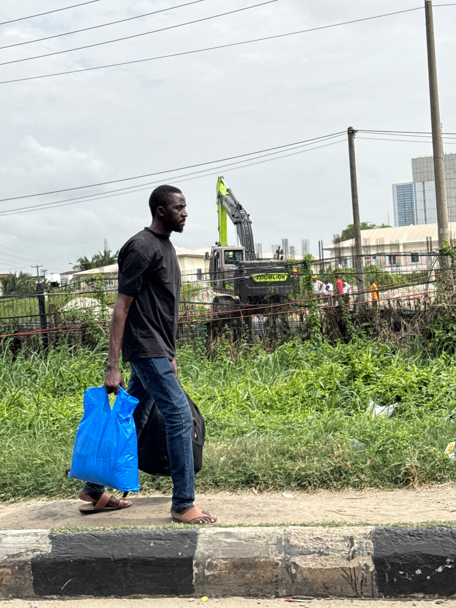 A man is walking along a sidewalk in Ilado, Nigeria. He is wearing a black t-shirt and blue jeans, and he is carrying a blue plastic bag in his left hand and a black backpack on his back. He is walkinβ¦read more