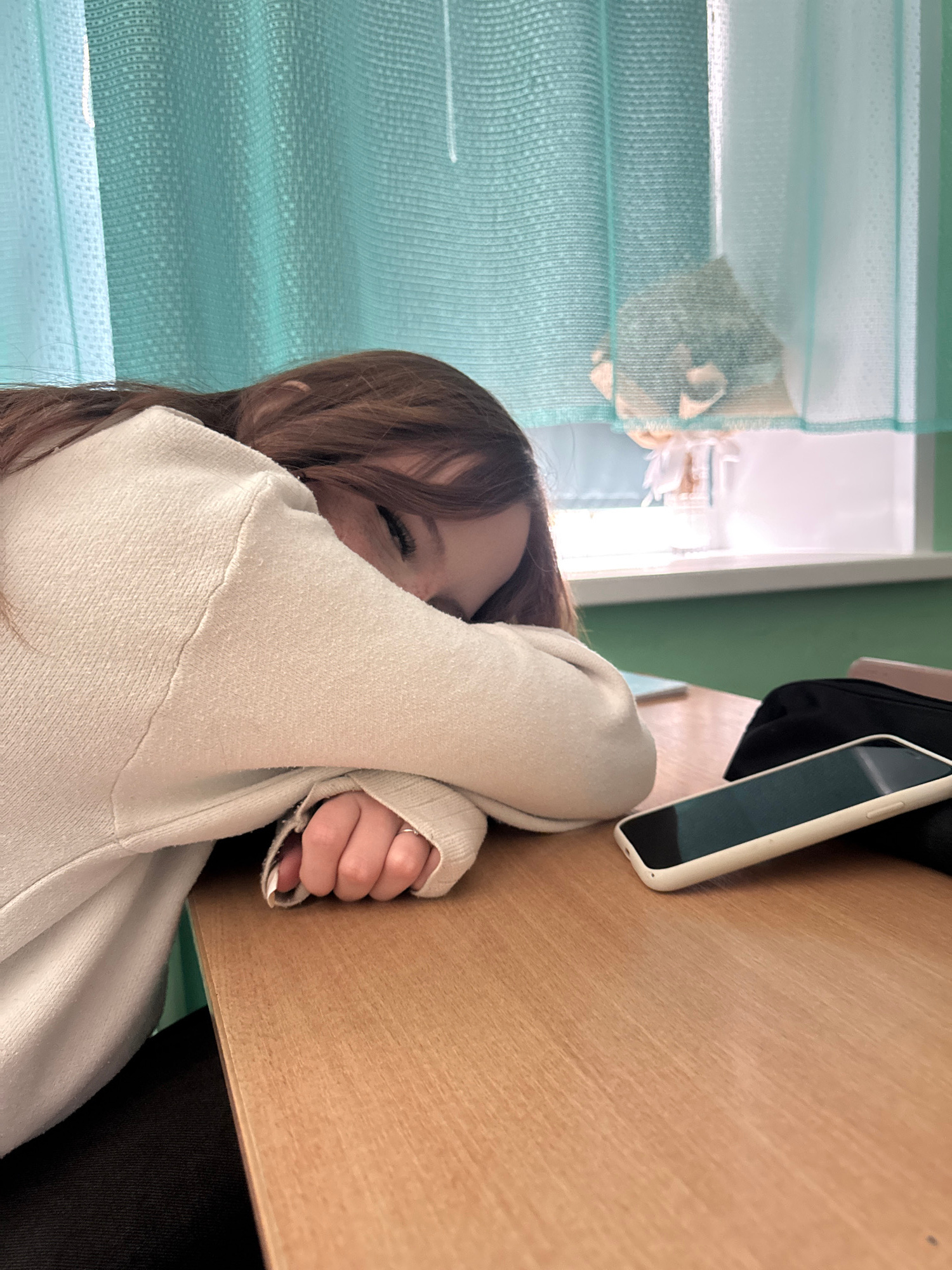 A person with long brown hair is seated at a light brown table, their face partially obscured by their cream-colored sweatshirt sleeve and hand. A white-cased smartphone lies on the table to the right…read more