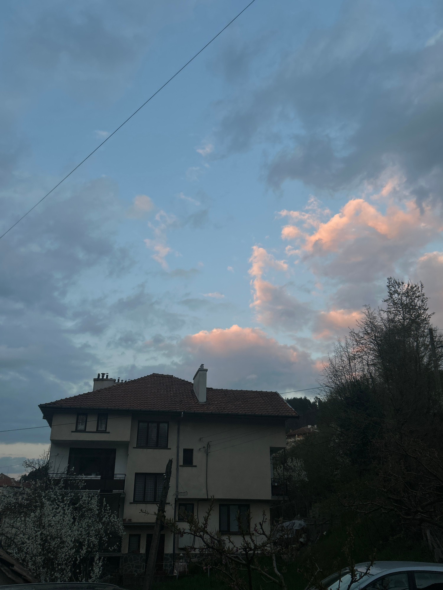 The image presents an exterior view, likely taken at dusk. A two-story building with a red-tiled roof is positioned on the right side of the frame. The building's facade is light-colored with dark-fra…read more