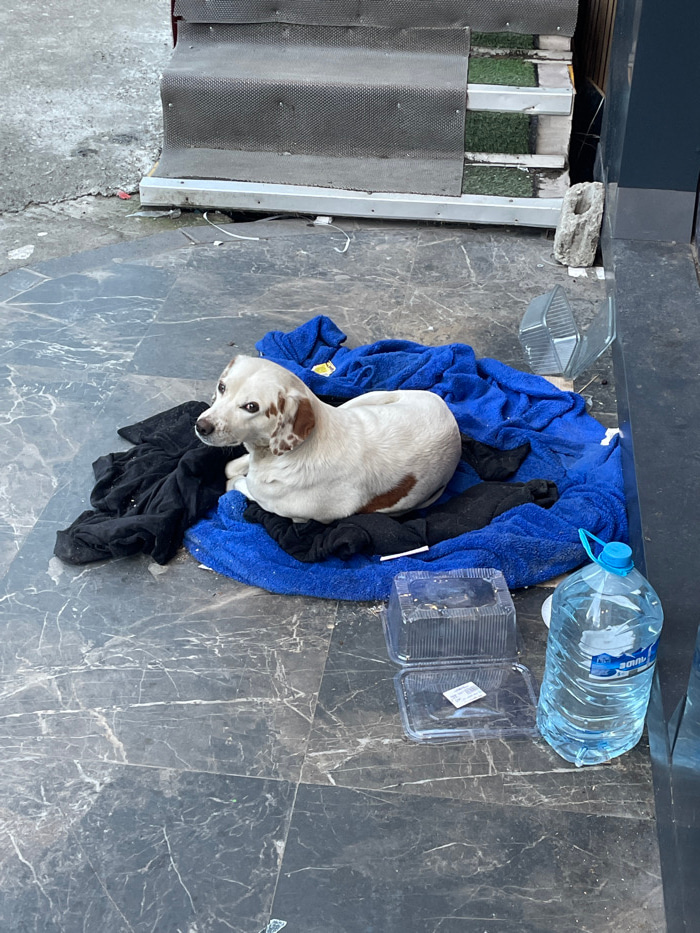 A white-furred dog with tan patches on its ears and right flank is observed resting on a crumpled blue towel and black fabric pieces on a dark grey, marbled tiled pavement in Batumi, Georgia. The dog…read more