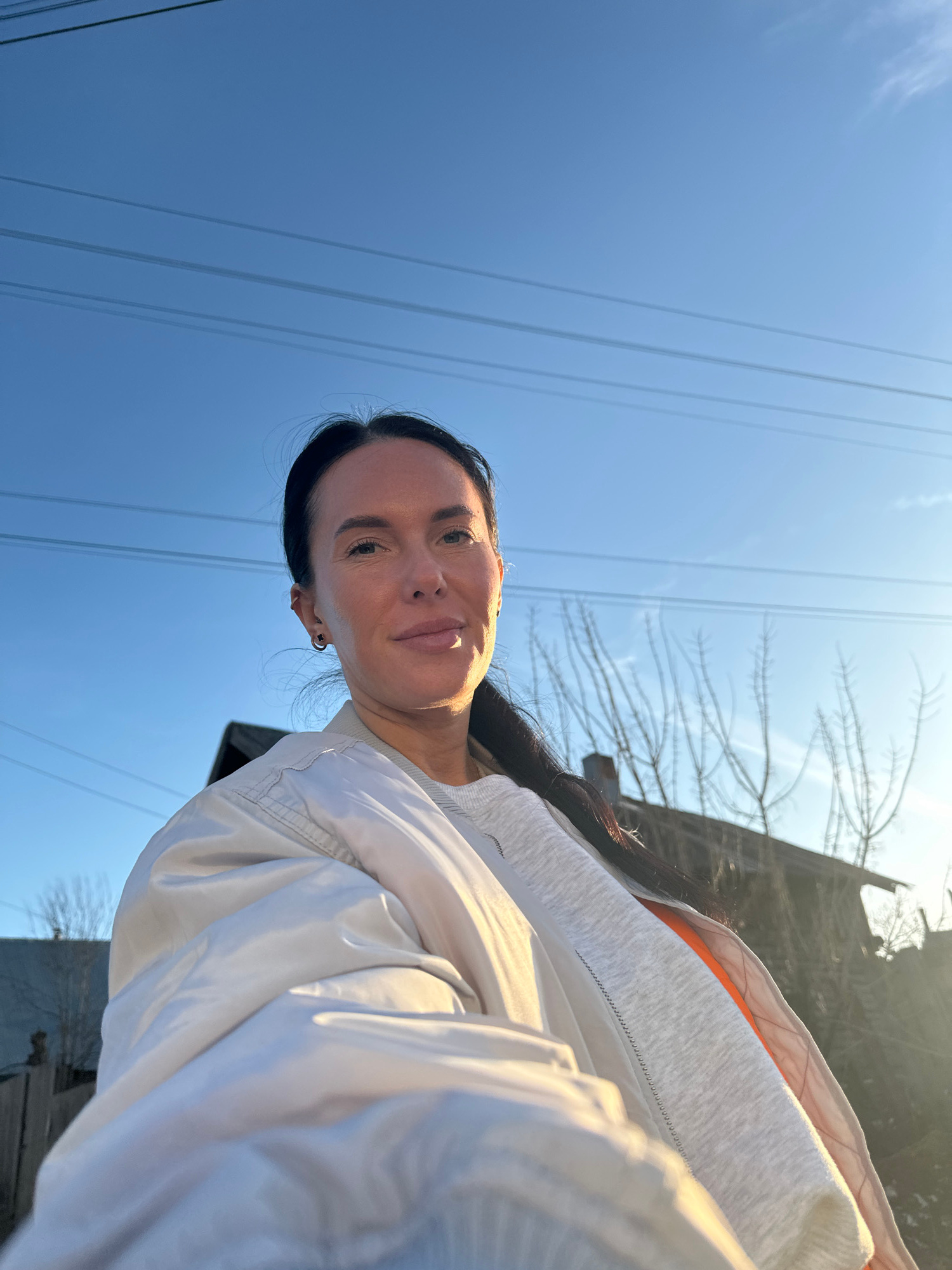 A woman is captured in a close-up outdoor portrait, looking directly at the camera. She has dark hair, styled away from her face, and a neutral to slightly pleasant expression. She appears to be weari…read more