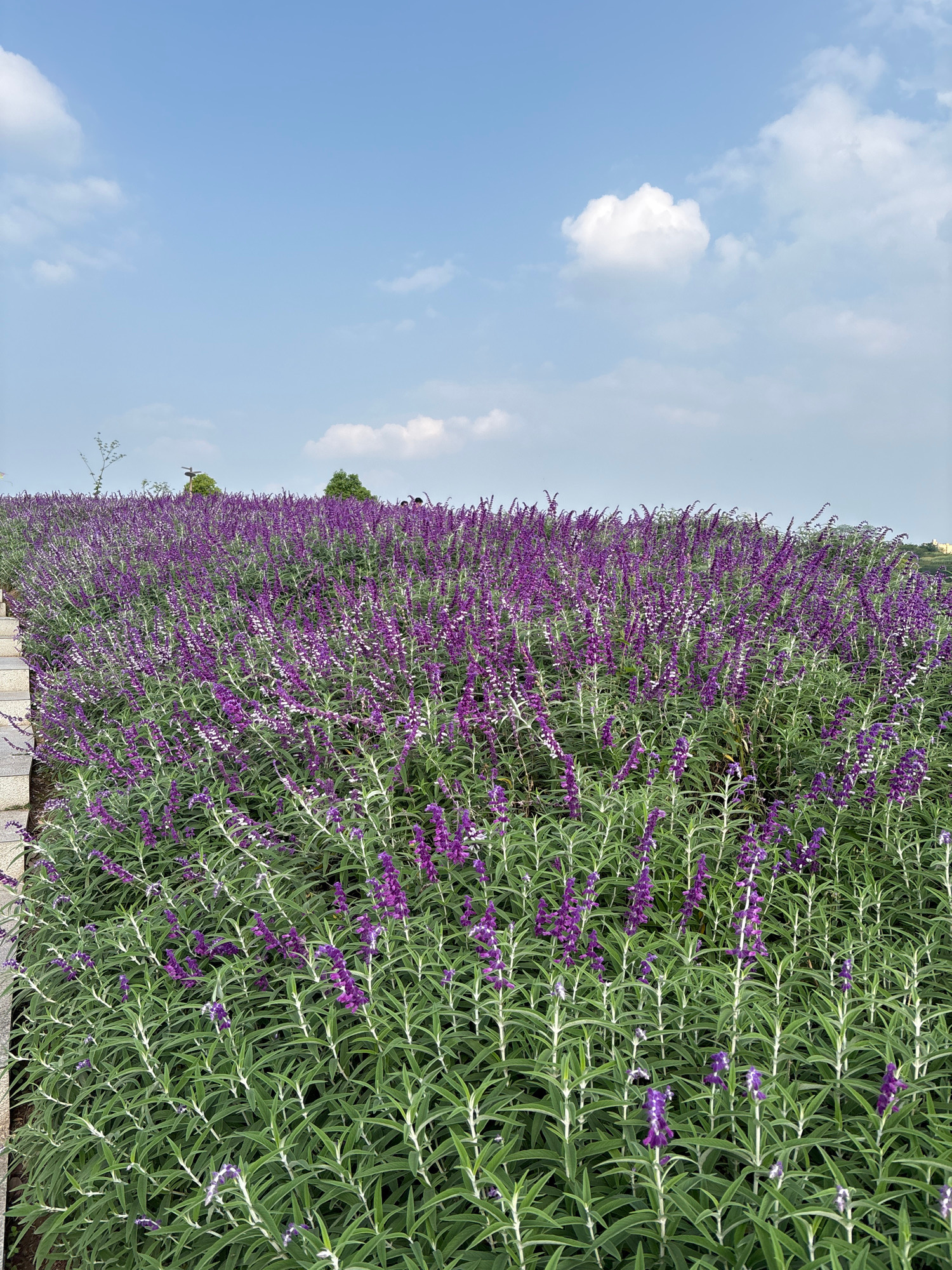 The image shows a field of purple salvia flowers under a partly cloudy, light blue sky. The perspective is a ground-level view, possibly taken from near the edge of the flower field. The flowers are d…read more