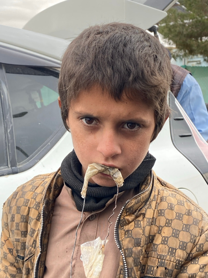 A young male, appearing to be a boy, is centrally depicted in Kandahar, Afghanistan. He has short, dark, textured hair and dark eyes, looking directly at the camera with a serious expression. He wears…read more