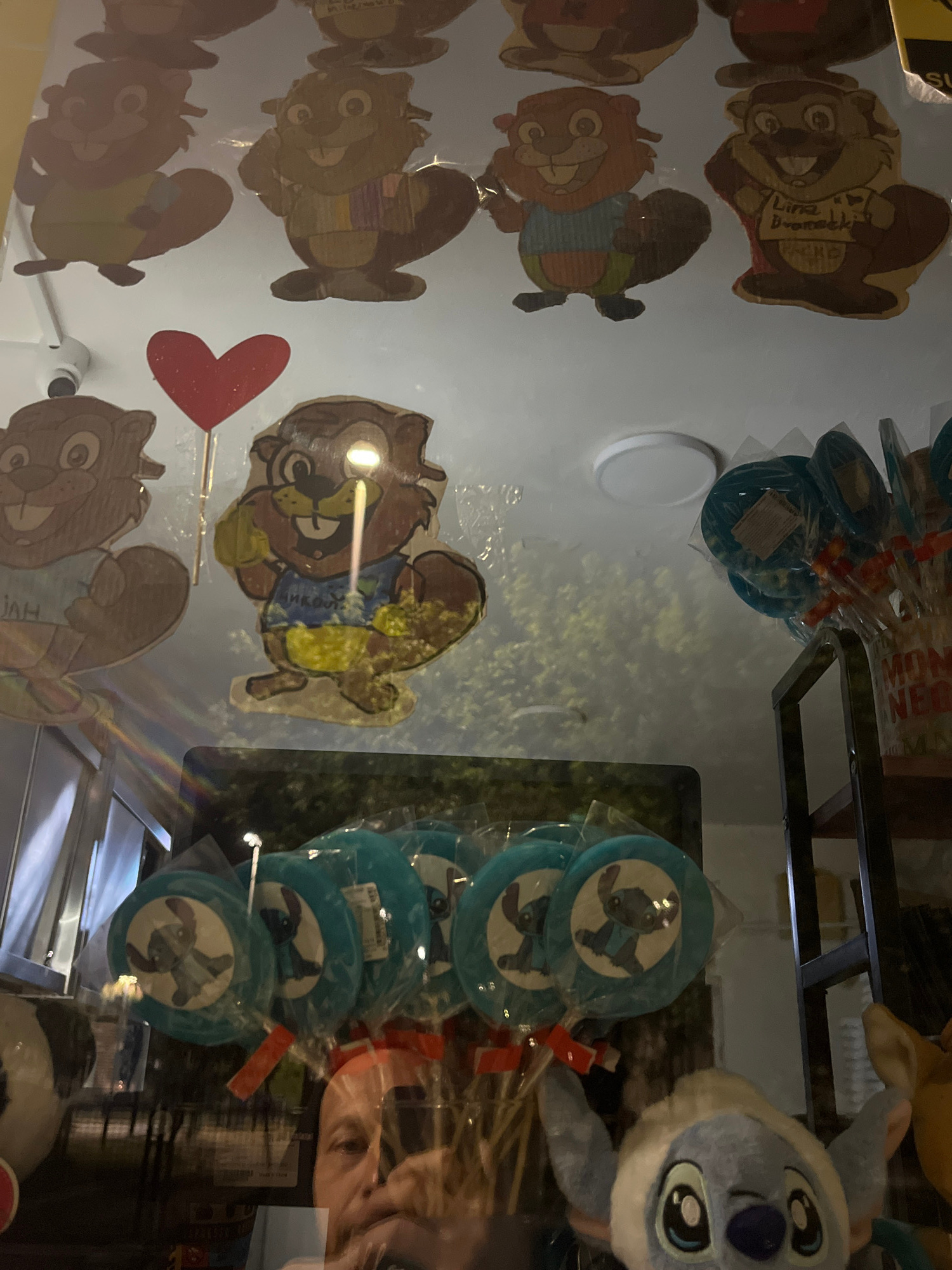 The image shows a display in what appears to be a store or shop in Budva, Montenegro. The display features a selection of souvenirs and merchandise likely targeting tourists. On the left side of the f…read more