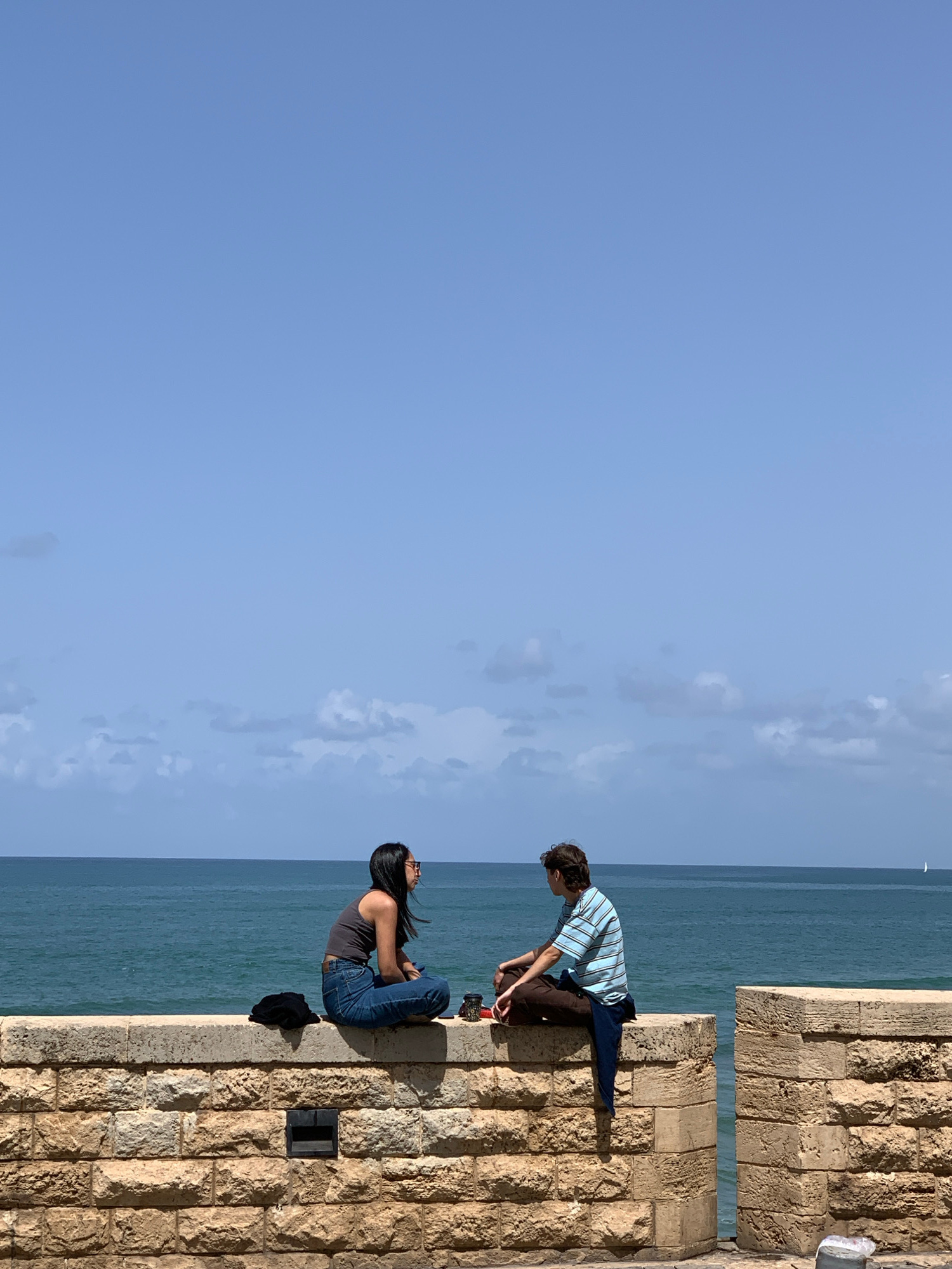 Two individuals are positioned on a stone wall overlooking the ocean. A male, wearing a striped shirt and dark pants, is leaning towards the other. A female, wearing a tank top and jeans, is seated. T…read more