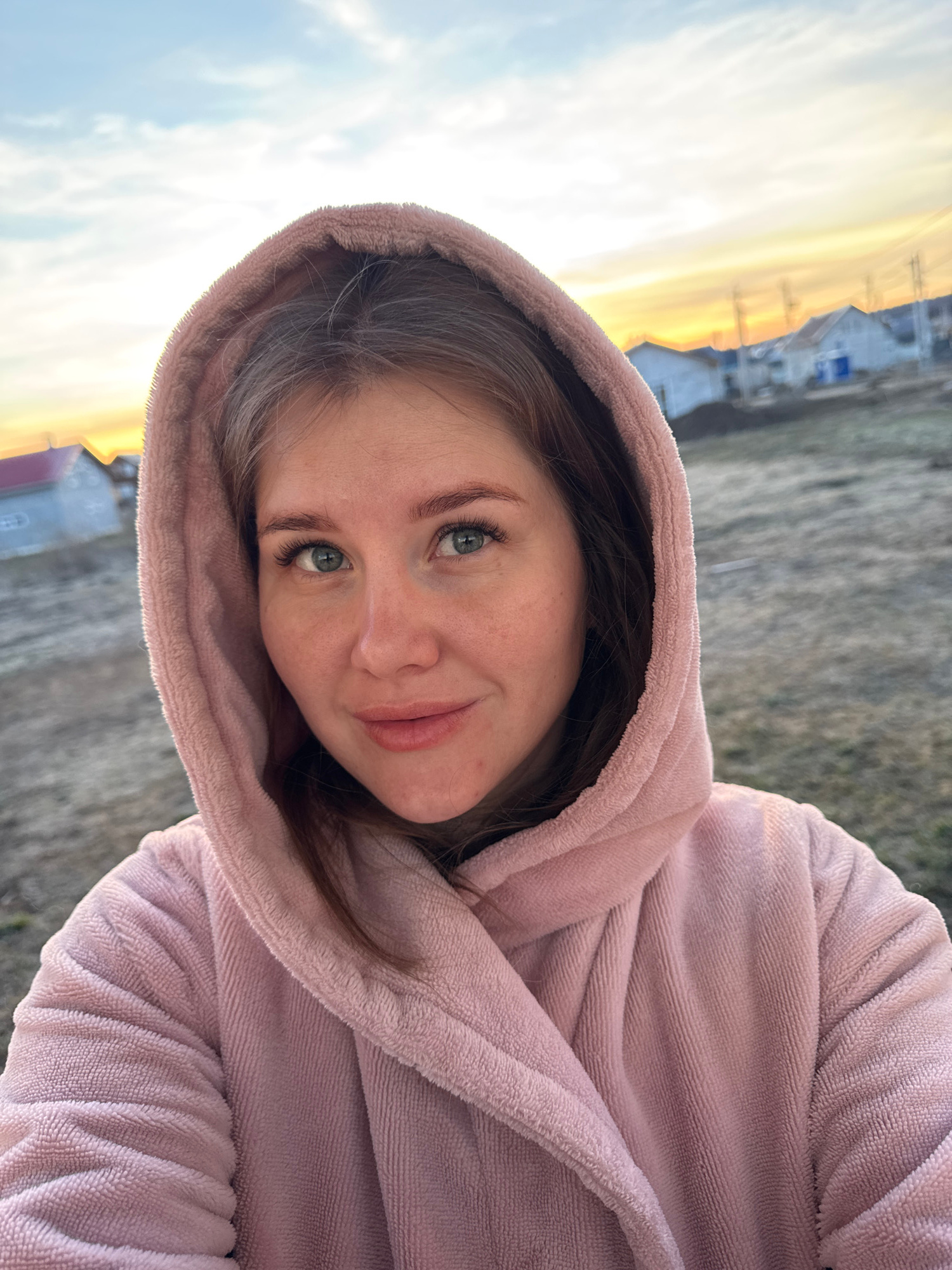 A portrait-oriented image features a young woman outdoors, likely captured during the golden hour of either sunrise or sunset, in a rural or semi-rural setting consistent with Gornyi (Dvurechenskoe S/…read more