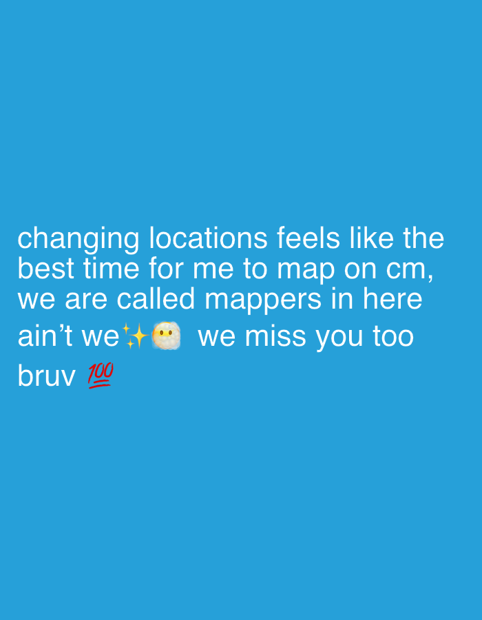 The image shows white text on a blue background. The text reads: "changing locations feels like the best time for me to map on cm, we are called mappers in here ain't we β¨βοΈ we miss you too bruv π―" Tβ¦read more