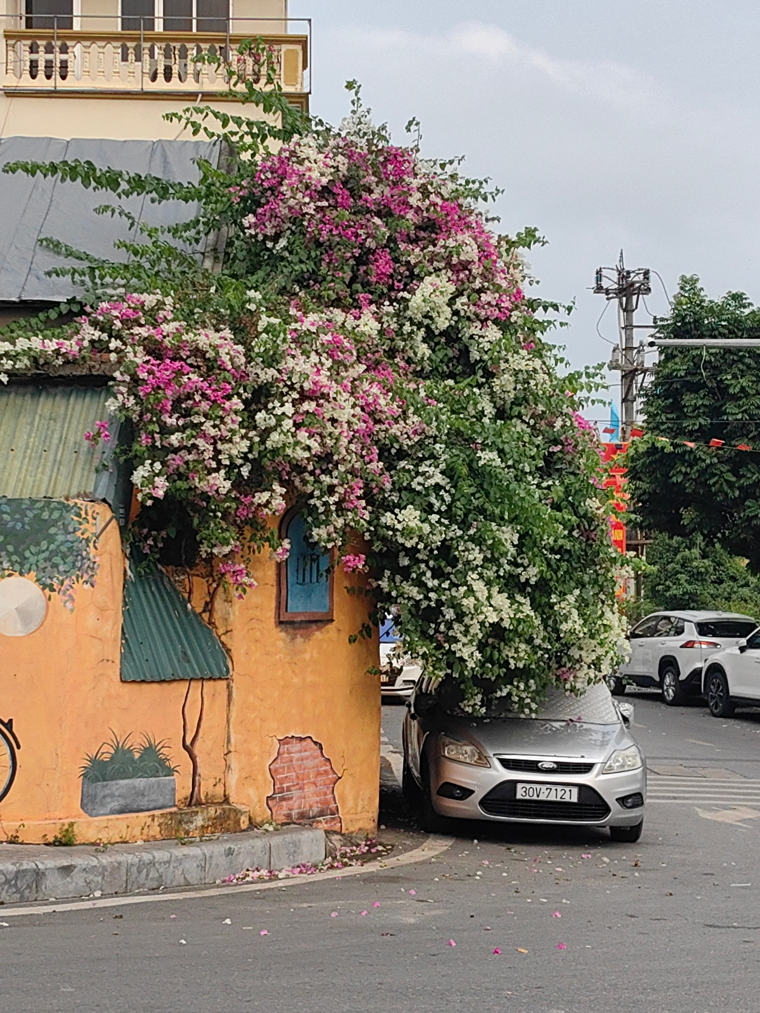 This image depicts a vibrant street corner in Hong Gai Ward, Vietnam, under an overcast sky during daytime. The primary subject is a low-rise, orange-painted building heavily adorned with lush bougain…read more