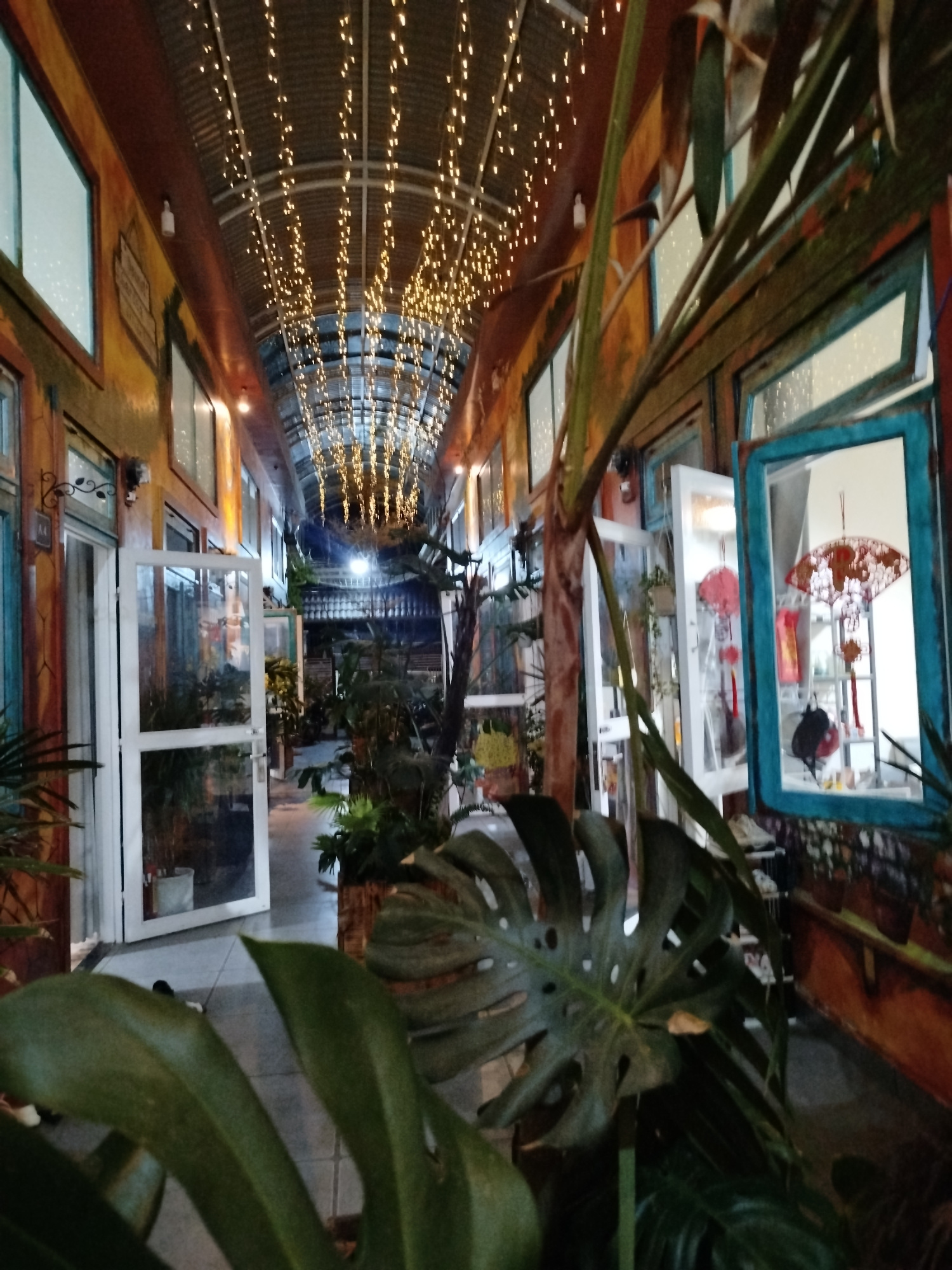 The image shows an indoor corridor or hallway in Da Lat, Vietnam, decorated with plants and string lights. The corridor is lined with windows and doors, some of which are open, offering glimpses of th…read more