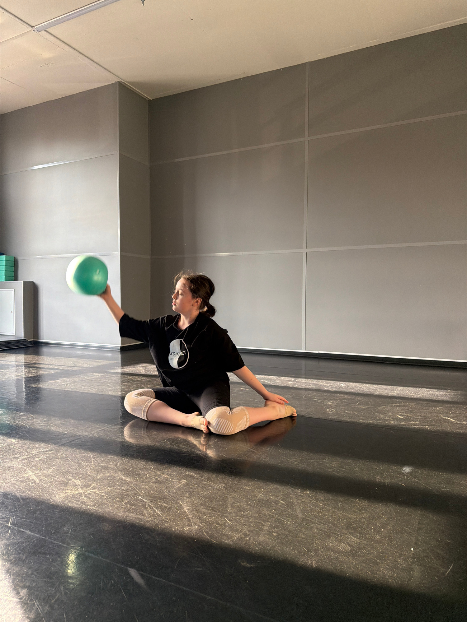A young female gymnast is shown sitting on a dark floor in a room with light-colored walls. She is wearing a black long-sleeved shirt, black leggings, and leg warmers. Her hair is pulled back in a pon…read more