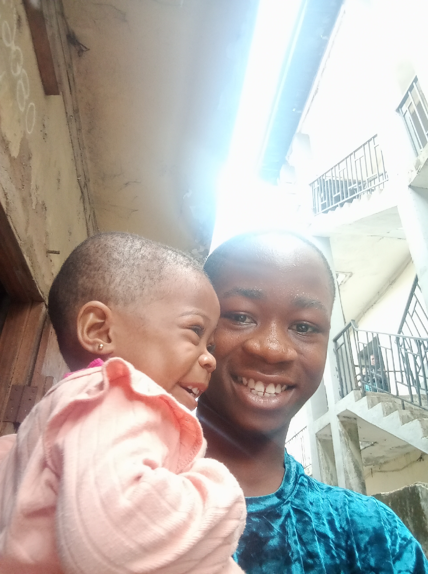 A young man holds a toddler in his arms, both smiling. The man wears a blue velvet shirt. The toddler wears a pink outfit and has a gold stud earring. They appear to be outside in a residential area w…read more