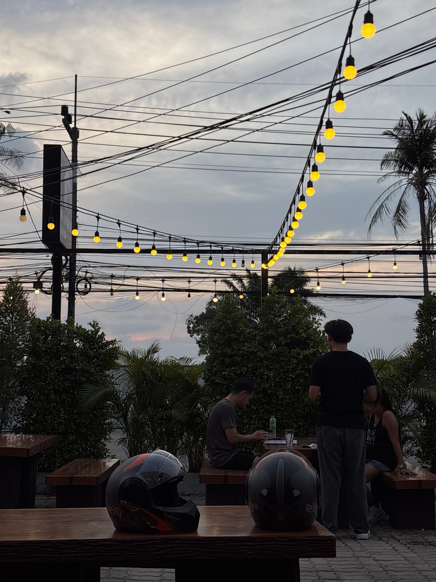 The image depicts an outdoor scene in Choeng Thale, Thailand. Two rows of string lights stretch overhead against a cloudy sky, with palm trees and other foliage visible in the background. Several peop…read more