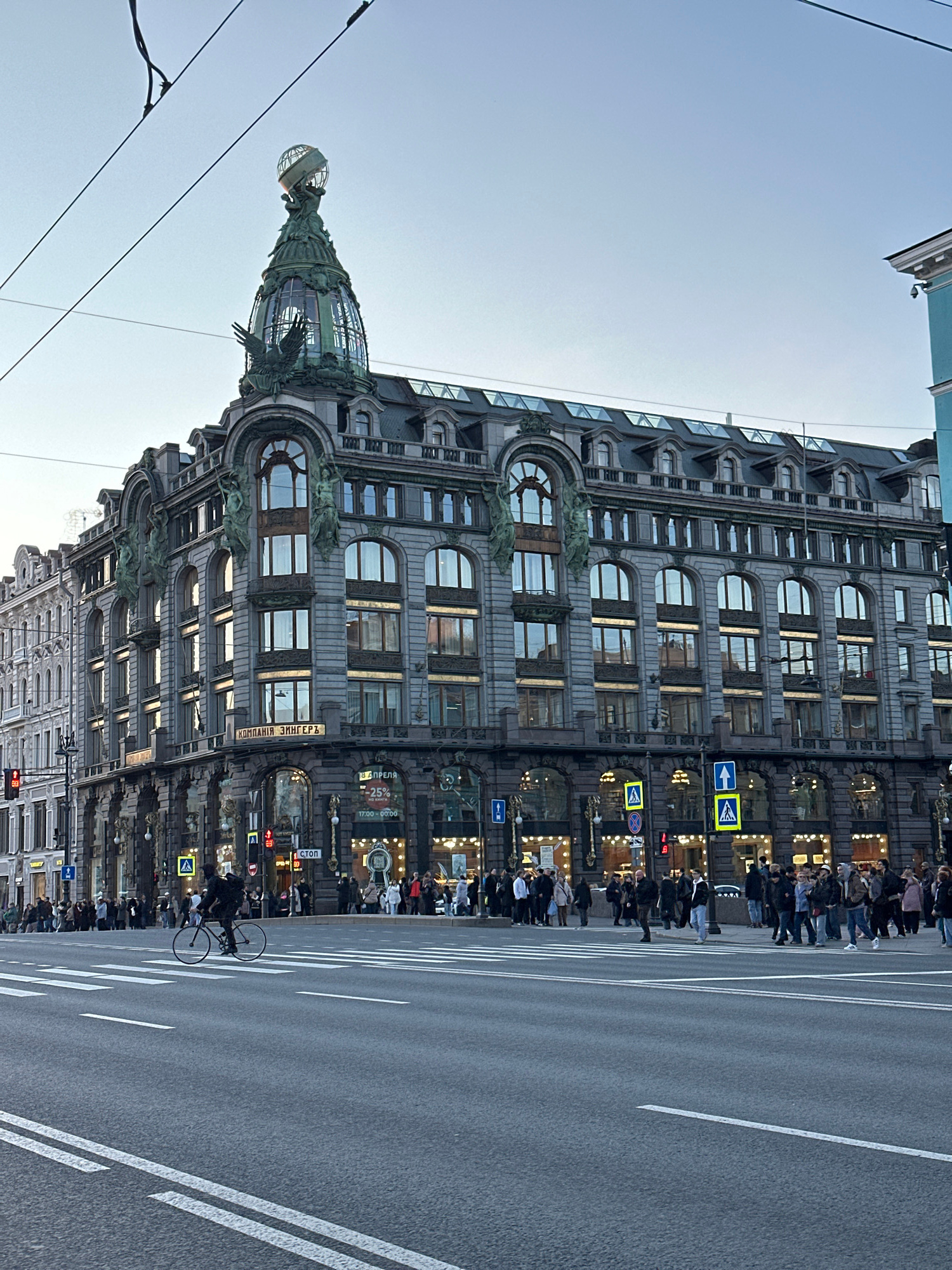 The image showcases the Singer House in Saint Petersburg, Russia, viewed from a low-angle perspective. The architectural details of the building are prominent, including its ornate facade, numerous ar…read more