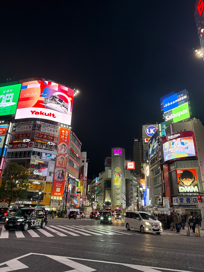 The image depicts a bustling street intersection in Shibuya, Japan, at night. The scene is dominated by multi-story buildings adorned with numerous brightly illuminated digital billboards and large di…read more