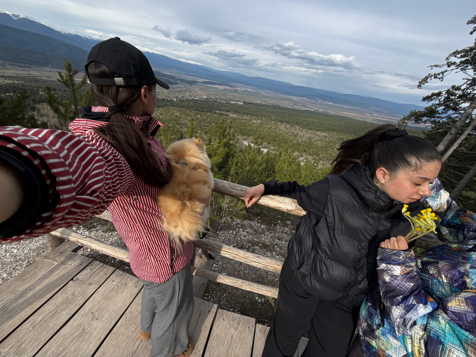 Two women stand on a wooden overlook platform, adjacent to a forested area and a view of Razlog, Bulgaria, below. The woman on the left wears a blue patterned jacket and black pants, holding yellow fl…read more