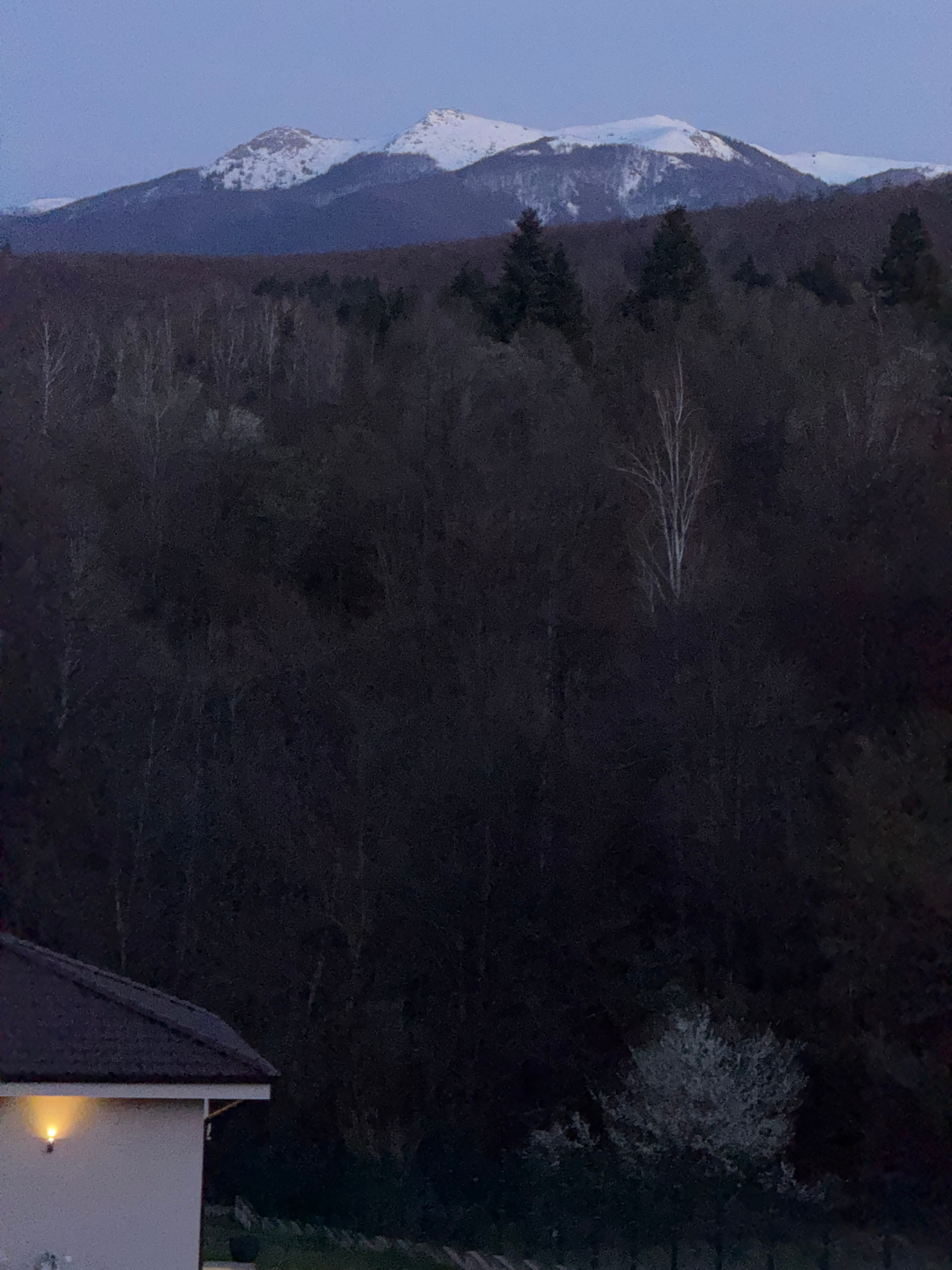 The image shows a mountain range partially covered in snow on the left side of the frame. A dense forest covers the hillside, with a few deciduous trees interspersed among the evergreens. A building i…read more