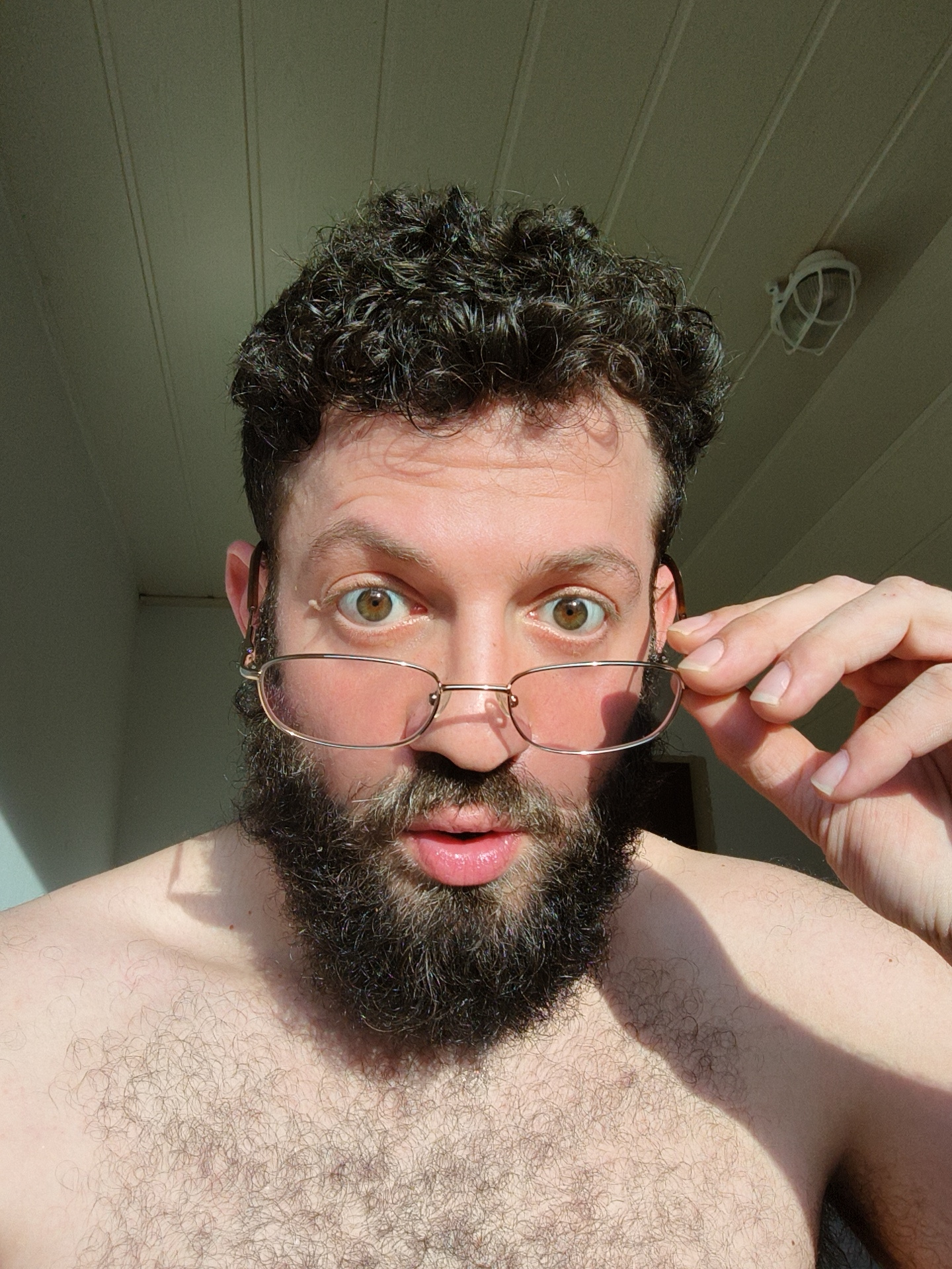 A shirtless man with a dark curly beard and hair is holding the right arm of a pair of glasses, with the left arm of the glasses positioned over the left ear. The man's eyes are wide with surprise. He…read more